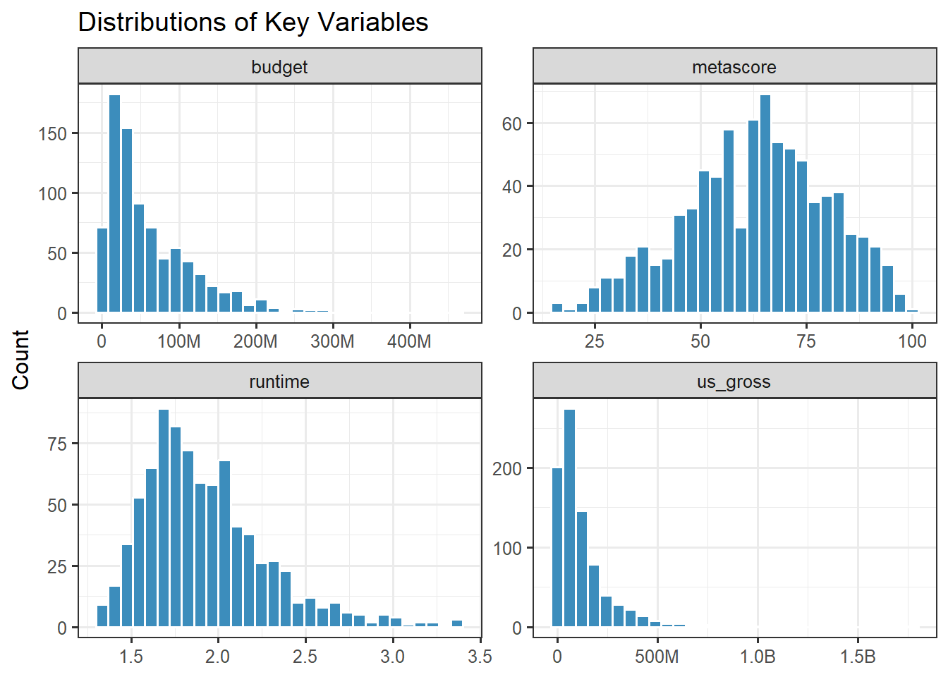 We begin with EDA to understand variable distributions, relationships, and potential data issues (outliers, missingness, skew)3. The jtools::movies dataset offers a realistic setting with continuous and discrete variables relevant to business/creative outcomes.
