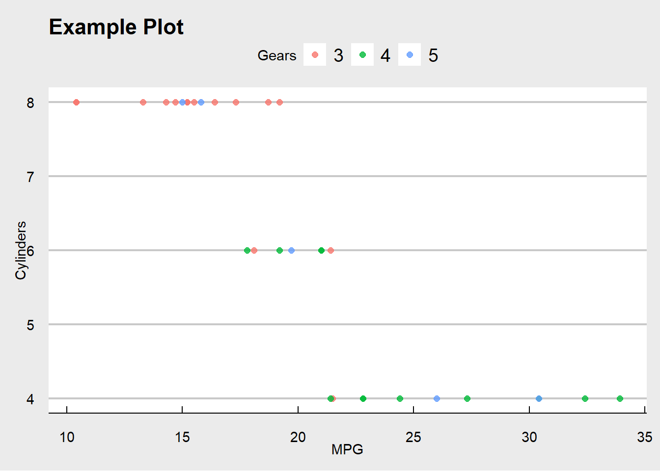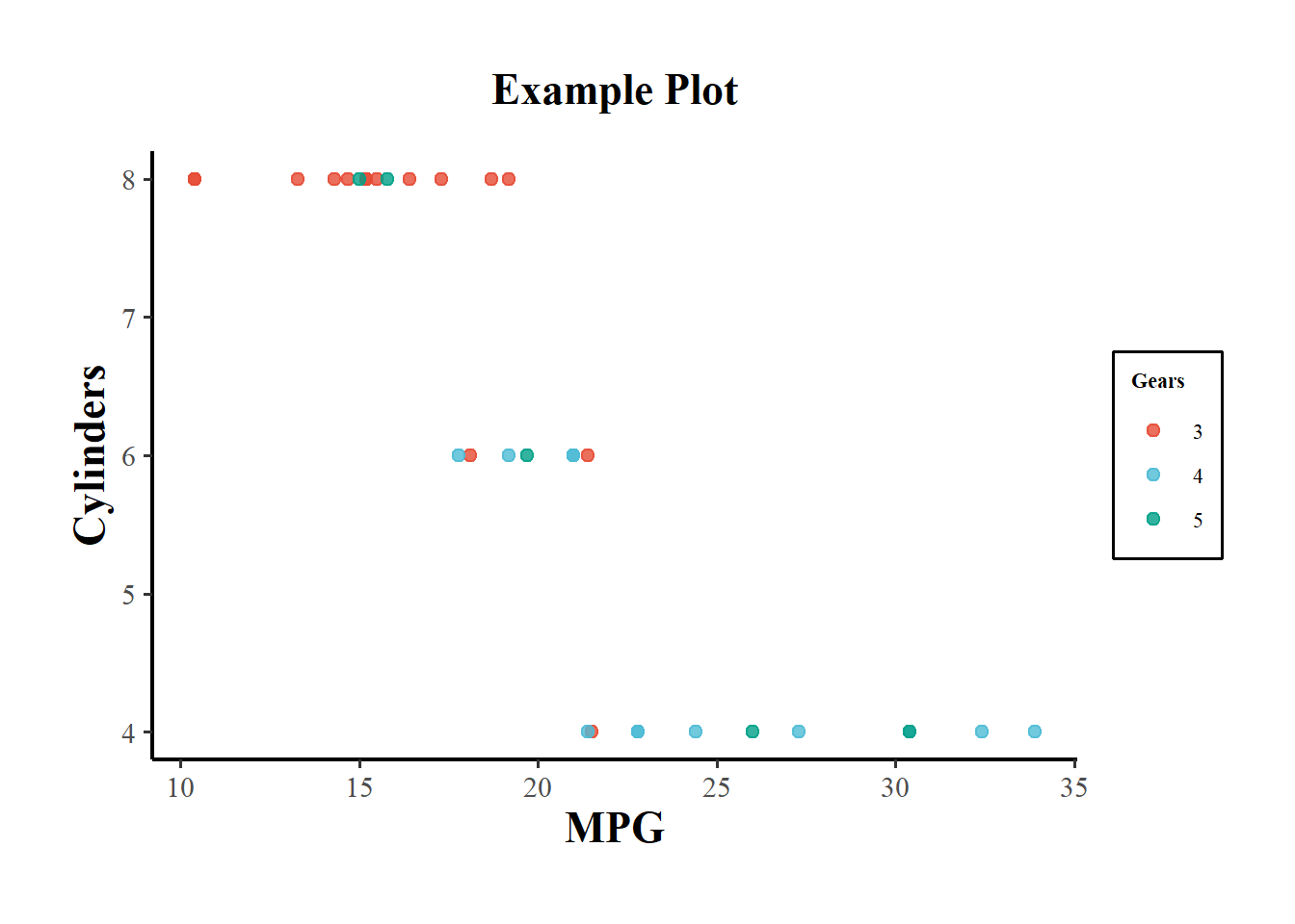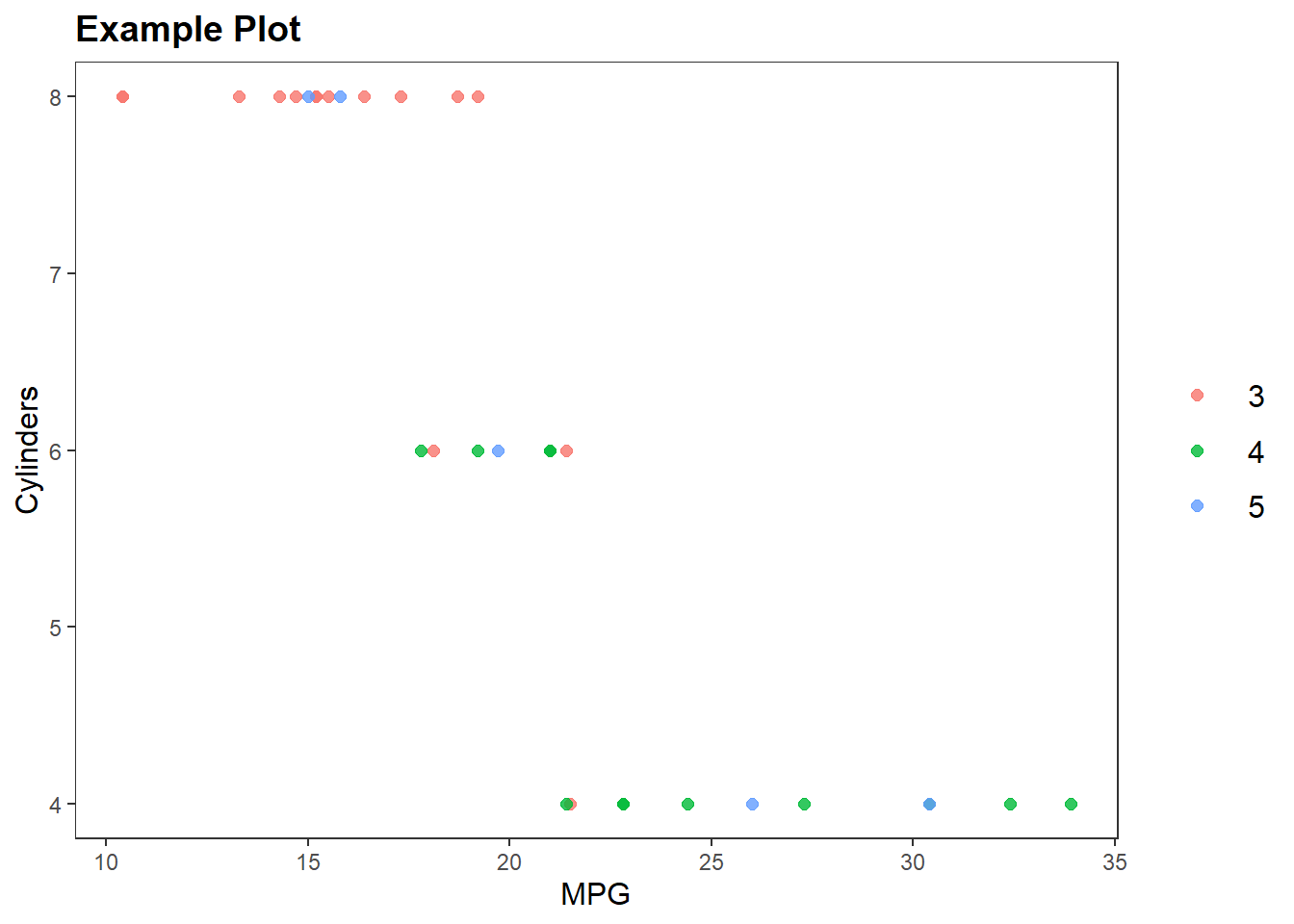 labs(title = "Example Plot", x = "MPG", y = "Cylinders", color = "Gears")