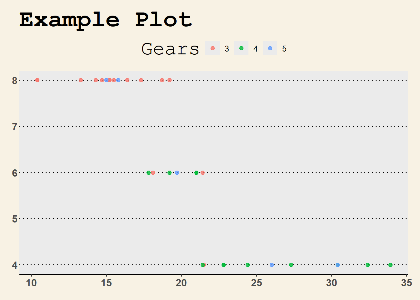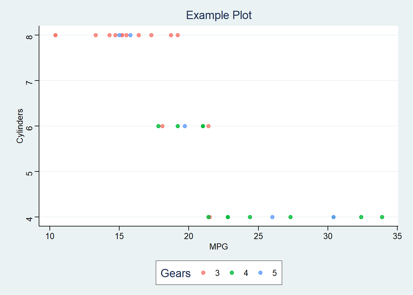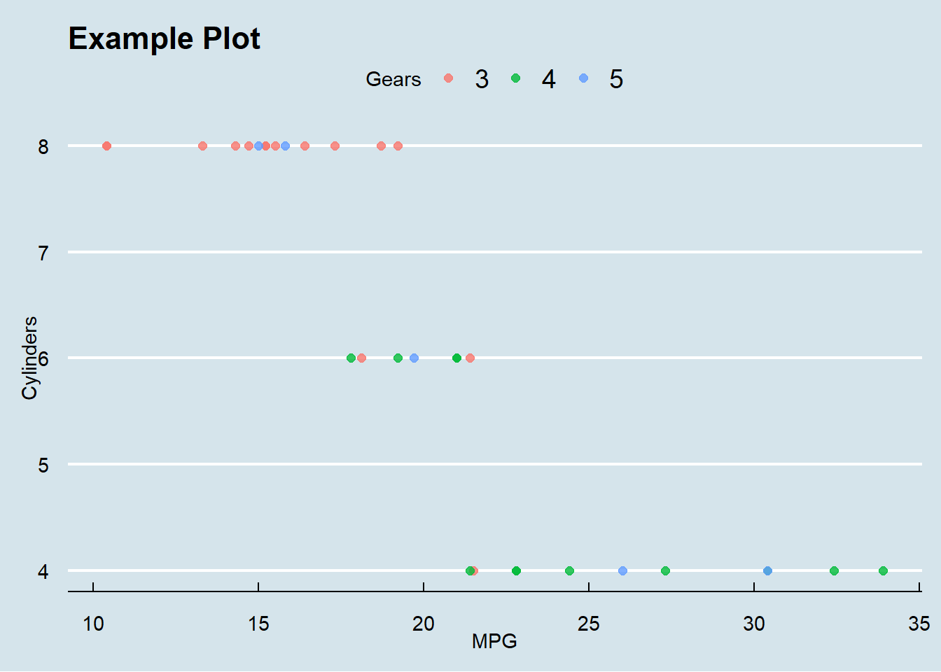 labs(title = "Example Plot", x = "MPG", y = "Cylinders", color = "Gears")