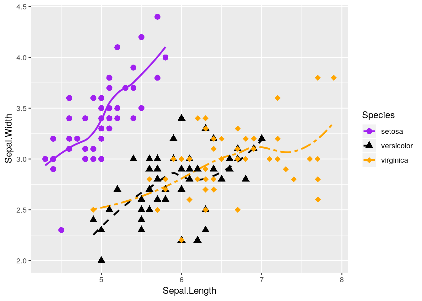 Each of these arguments can have different values, if we want to change our graph. For instance, if we wanted to color and add a trendline for each species of iris, we could do the following: