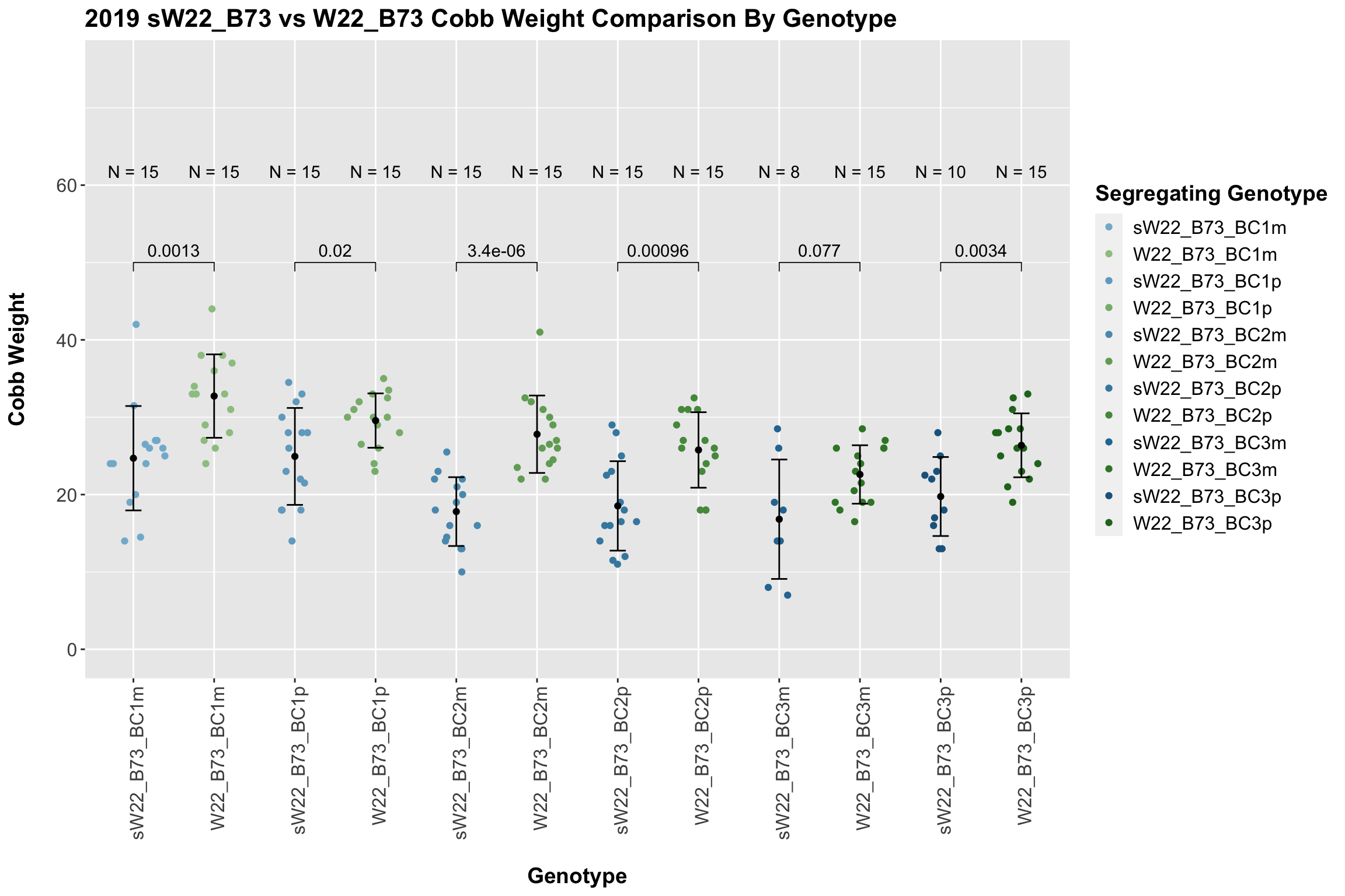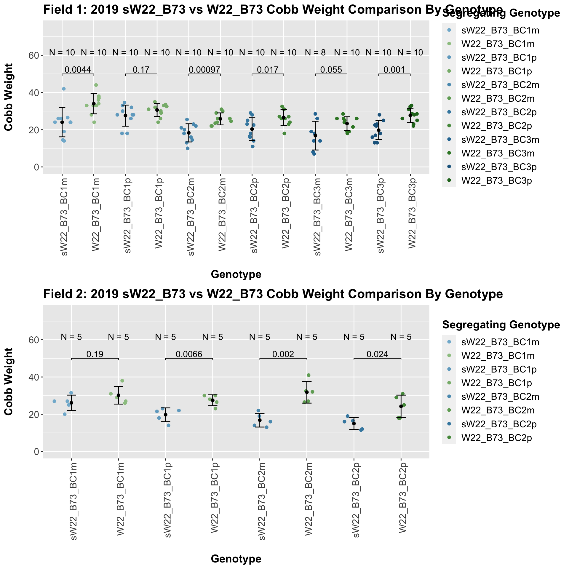 We find a significant reduction in cobb weight of the sW22_B73 backcrosses against the W22_B73 backcrosses. We find that this persists even when we stratify the data by field.