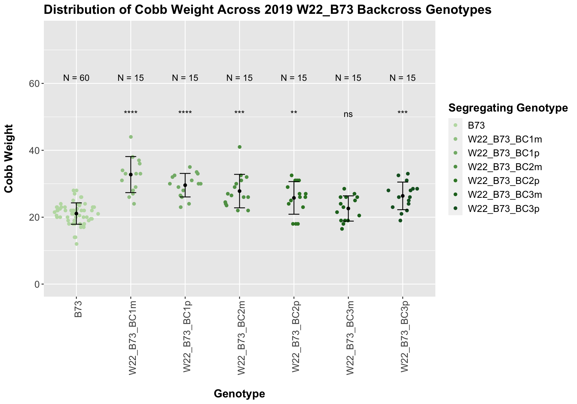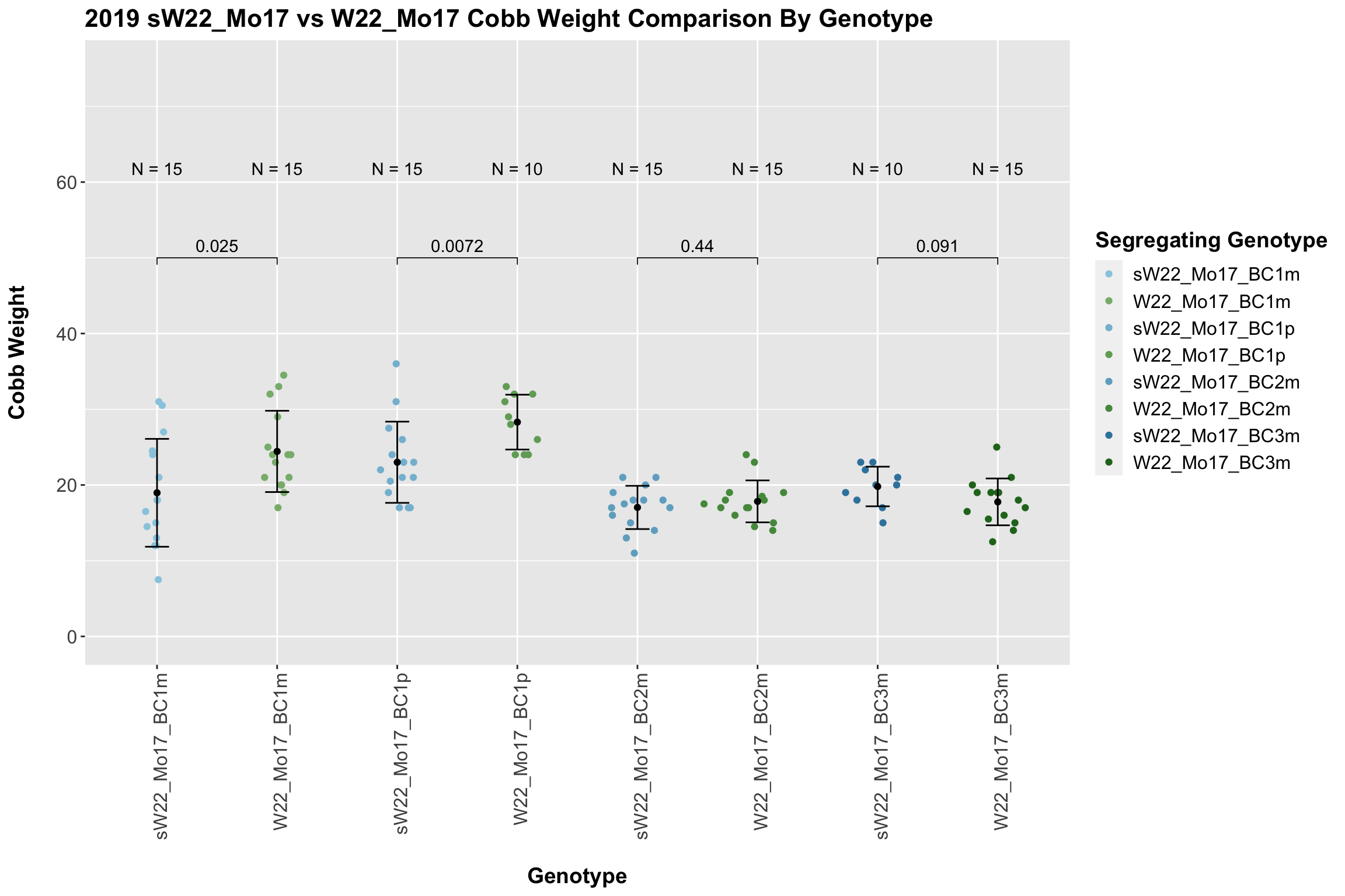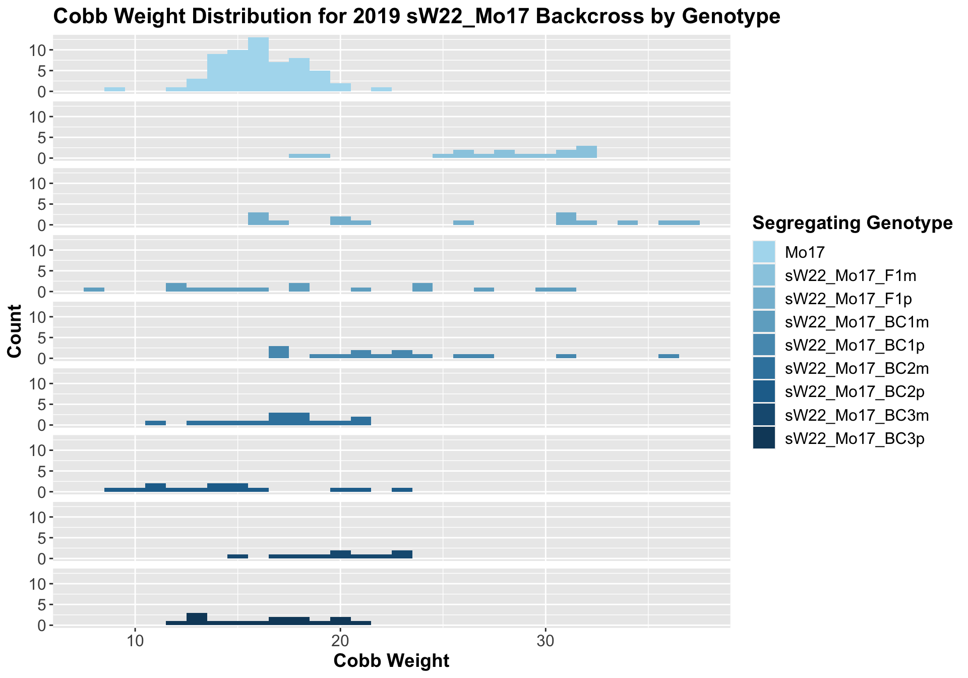 We see a significant increase in cobb weight at the sW22_Mo17 F1s that declines across subsequent backcrosses. By the later generations, it is not that different from the Mo17 cobb weight. This is similar to what we saw for the sW22_B73 backcross.