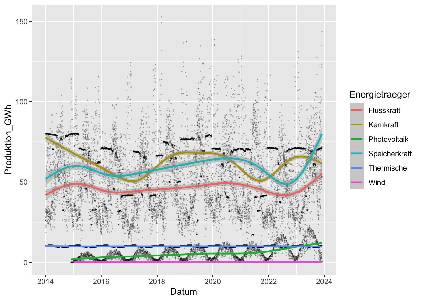 geom_smooth(aes(x = Datum, y = Produktion_GWh, color = Energietraeger))## `geom_smooth()` using method = 'gam' and formula = 'y ~ s(x, bs = "cs")'