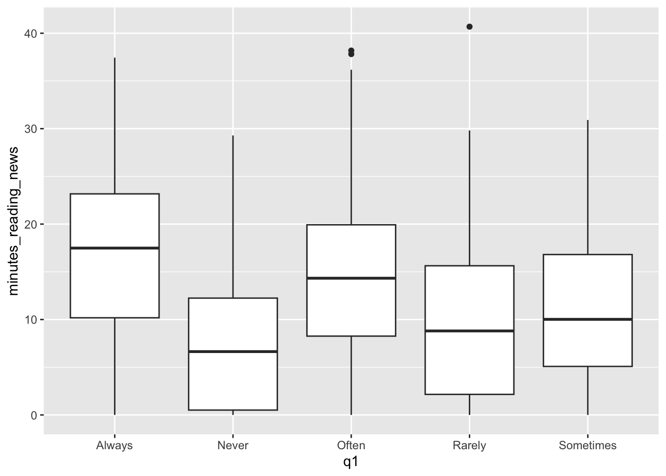 Just like when we were cleaning data, we can use the pipe operator to process data before we make a plot. This can be useful when we want to summarize data or change the order of the levels of a factor. Here, we’ll use the group_by() and summarize() functions to calculate the mean amount of time people spend reading the news for each level of question 1.