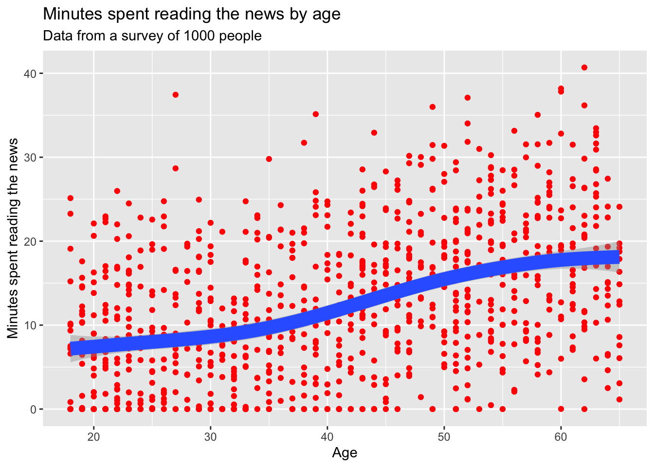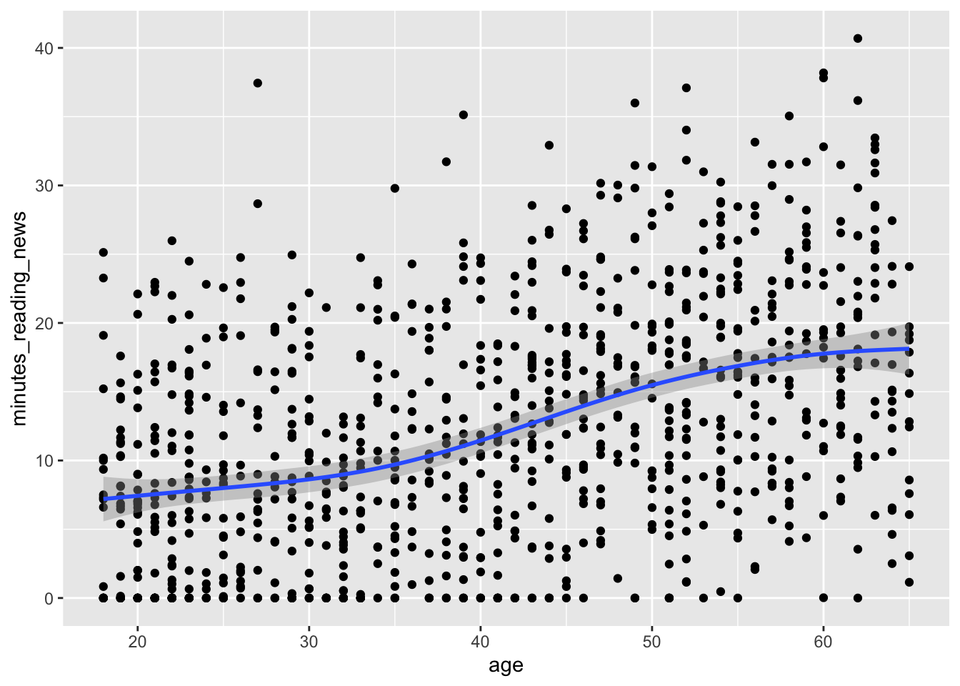 geom_smooth(aes(x = age, y = minutes_reading_news))## `geom_smooth()` using method = 'gam' and formula = 'y ~ s(x, bs = "cs")'
