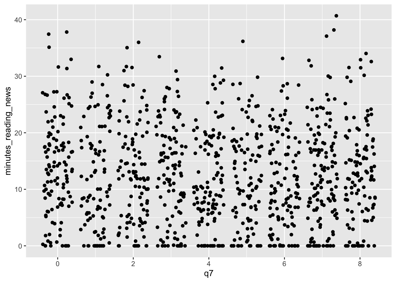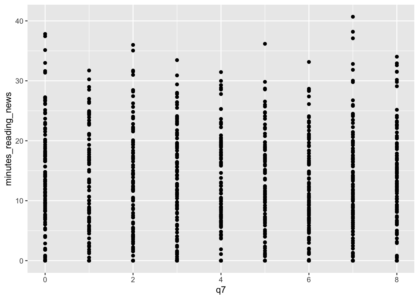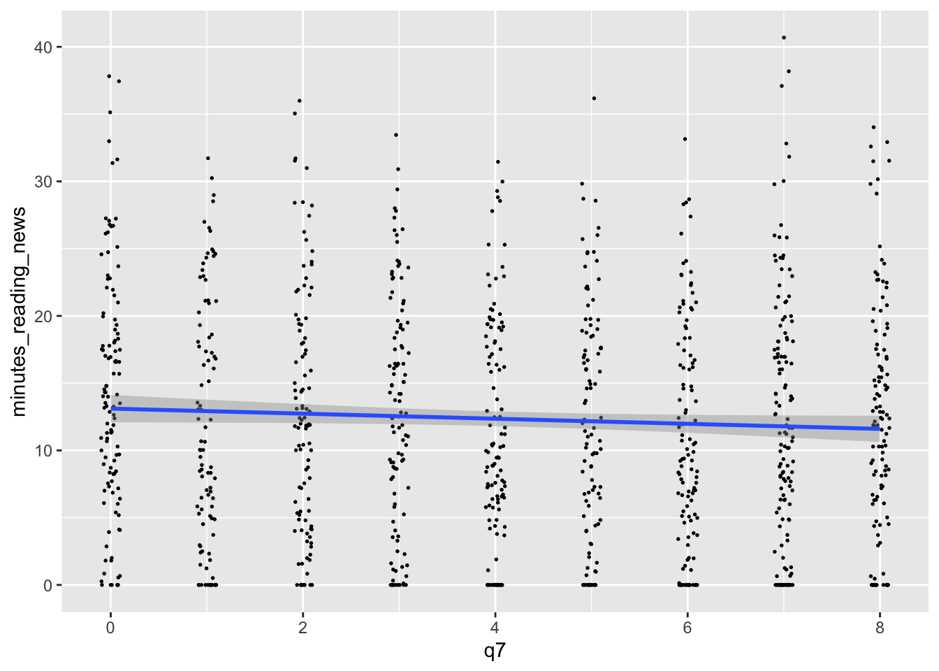 geom_smooth(aes(x = q7, y = minutes_reading_news), method = "lm")## `geom_smooth()` using formula = 'y ~ x'