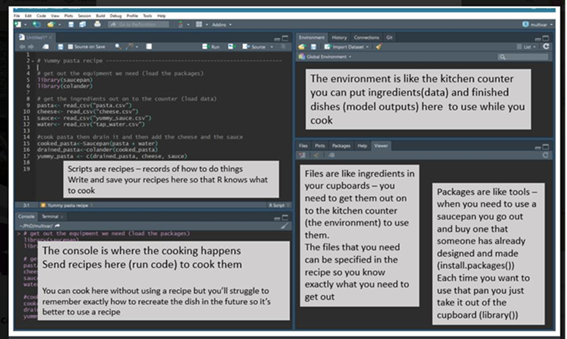 I also like this analogy demonstrating “what is for what” in RStudio using an example from cooking! (Thanks to Jessica Ward).
