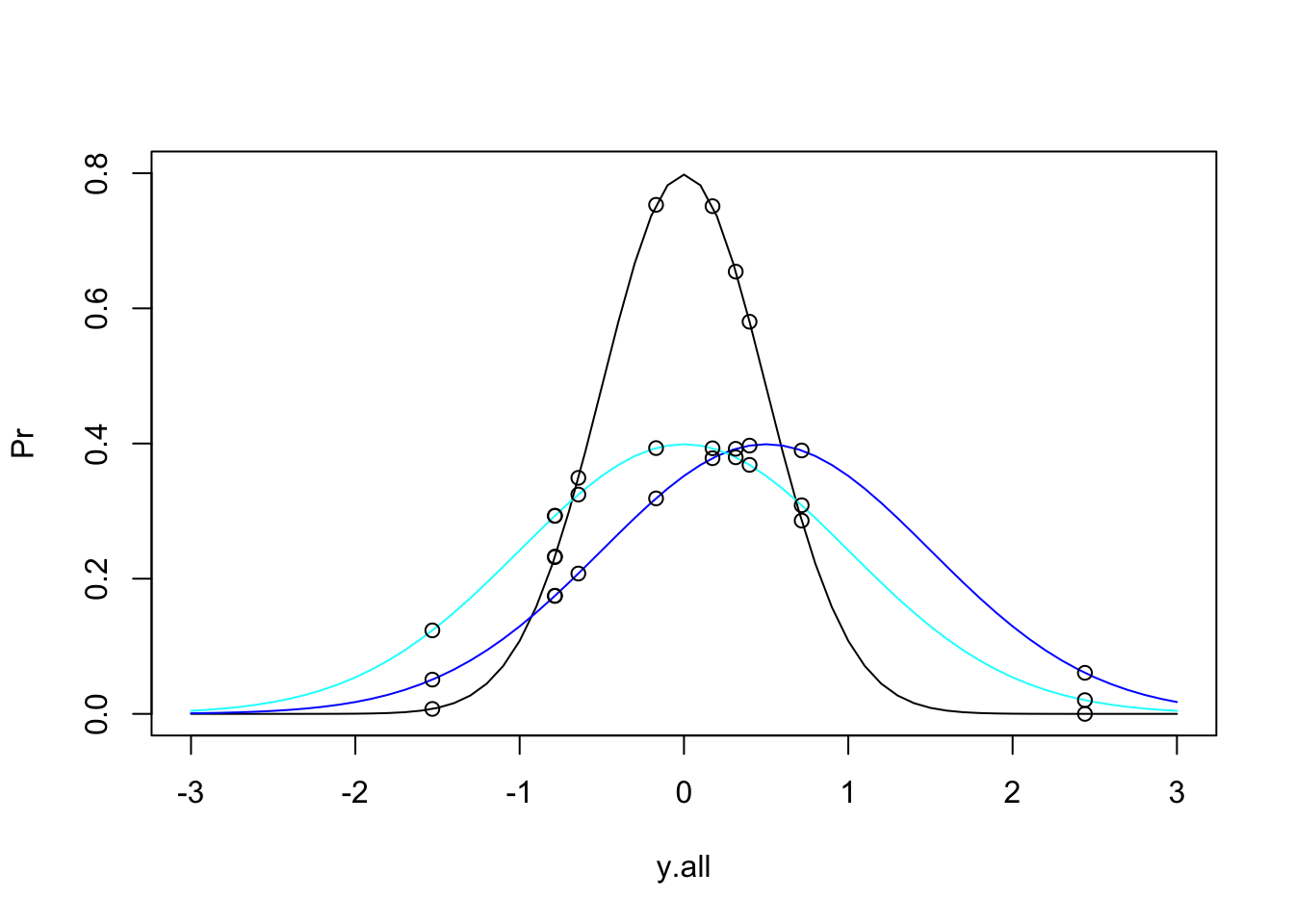 Pr3 = dnorm(y.all, mean = 0, sd = 1) #third curve has mean = 0.5 and sd = 1