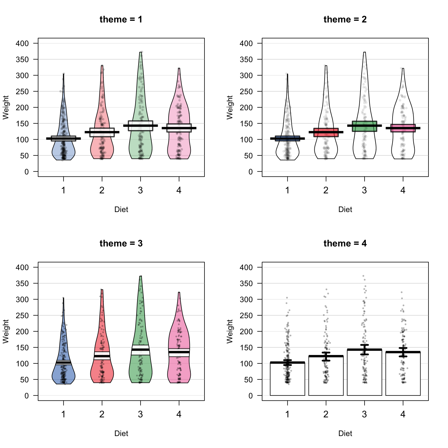 For example, I could create the following pirateplots using theme = 0 and specifying elements explicitly: