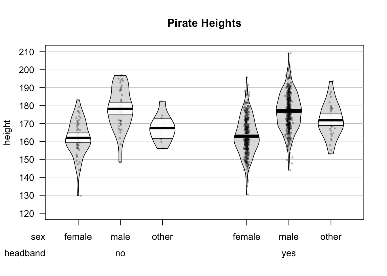 yarrr::pirateplot(formula = height ~ sex + headband, # DV = height, IV1 = sex, IV2 = headband
