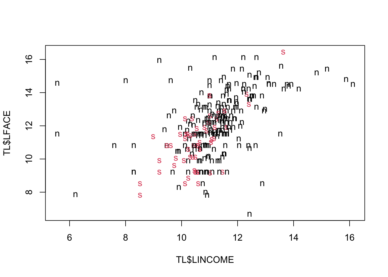 Si osservi che pairs funzionerebbe anche se le variabili coinvolte non sono numeriche. Ad ogni modalità del fattore vengono associati livelli numerici e si ottiene un grafico che tuttavia in molti casi risulterà privo di significato o di non facile interpretazione.