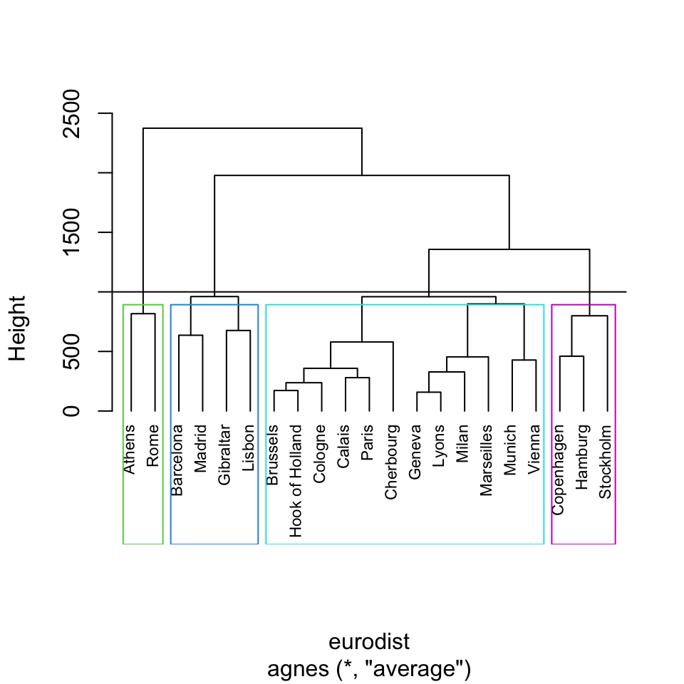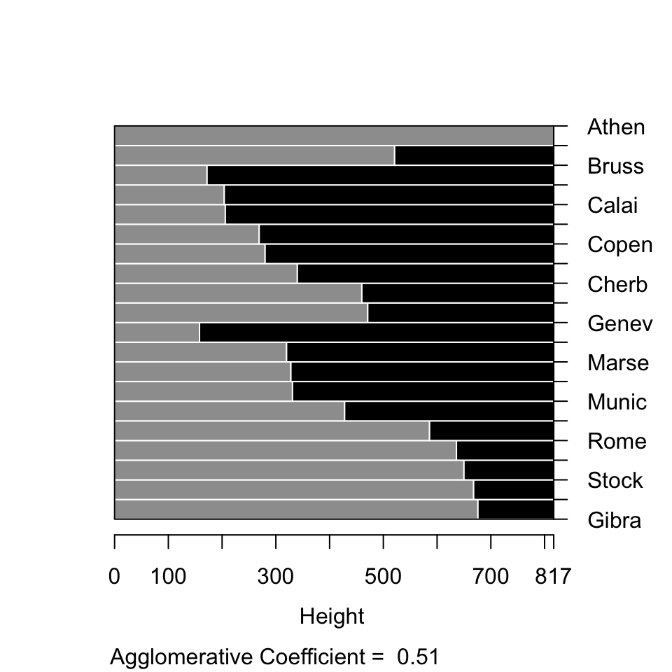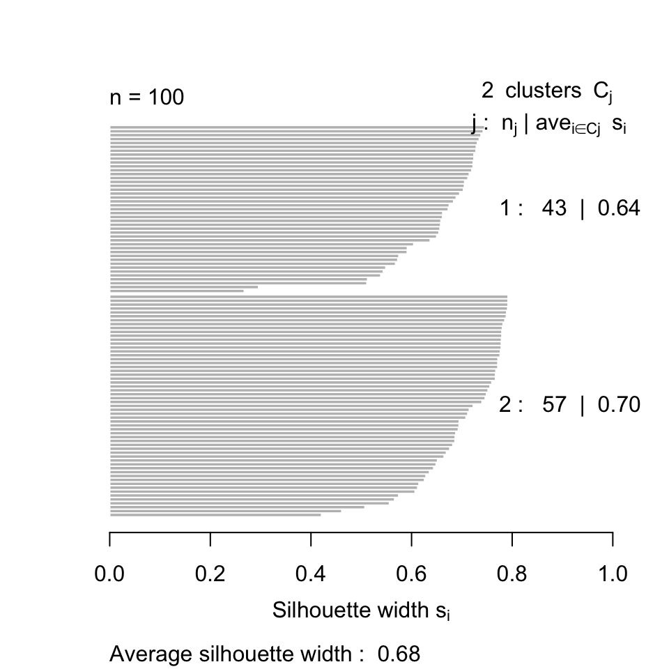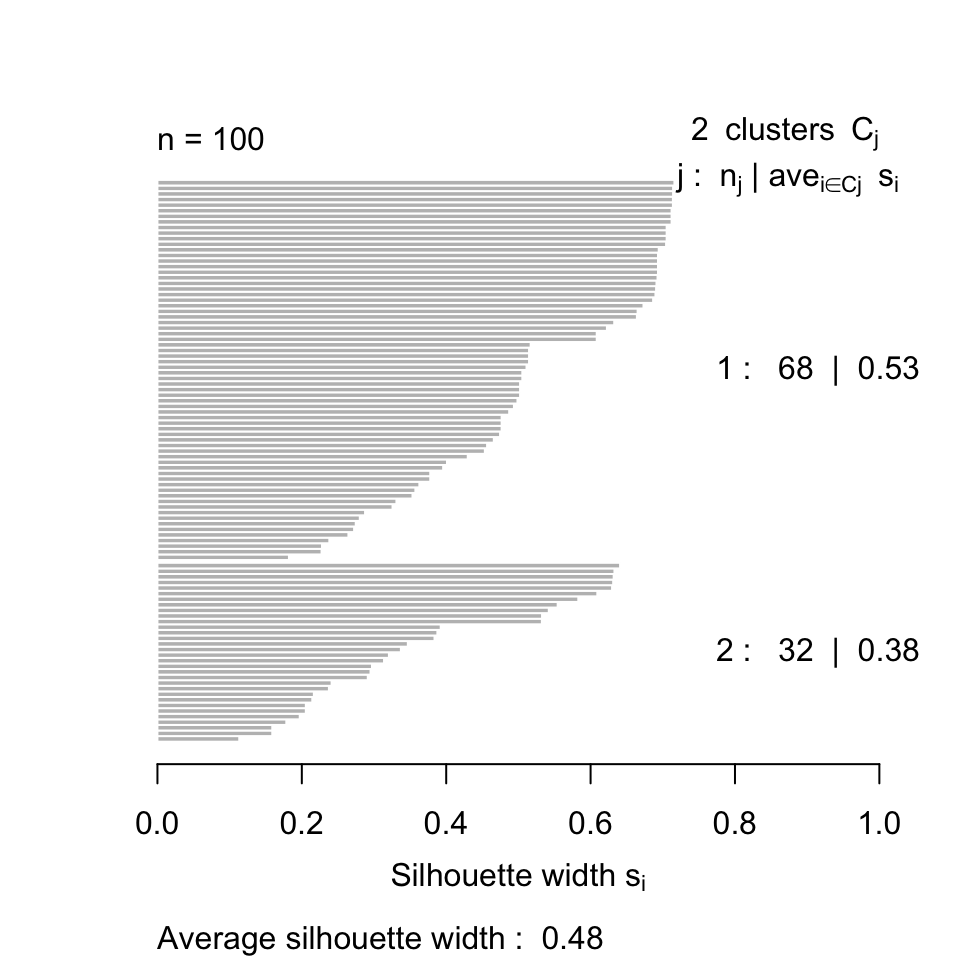 Infine, è semplice ottenere le silhouette da raggruppamenti gerarchici usando la funzione silhouette con cutree() e la distanza come input: