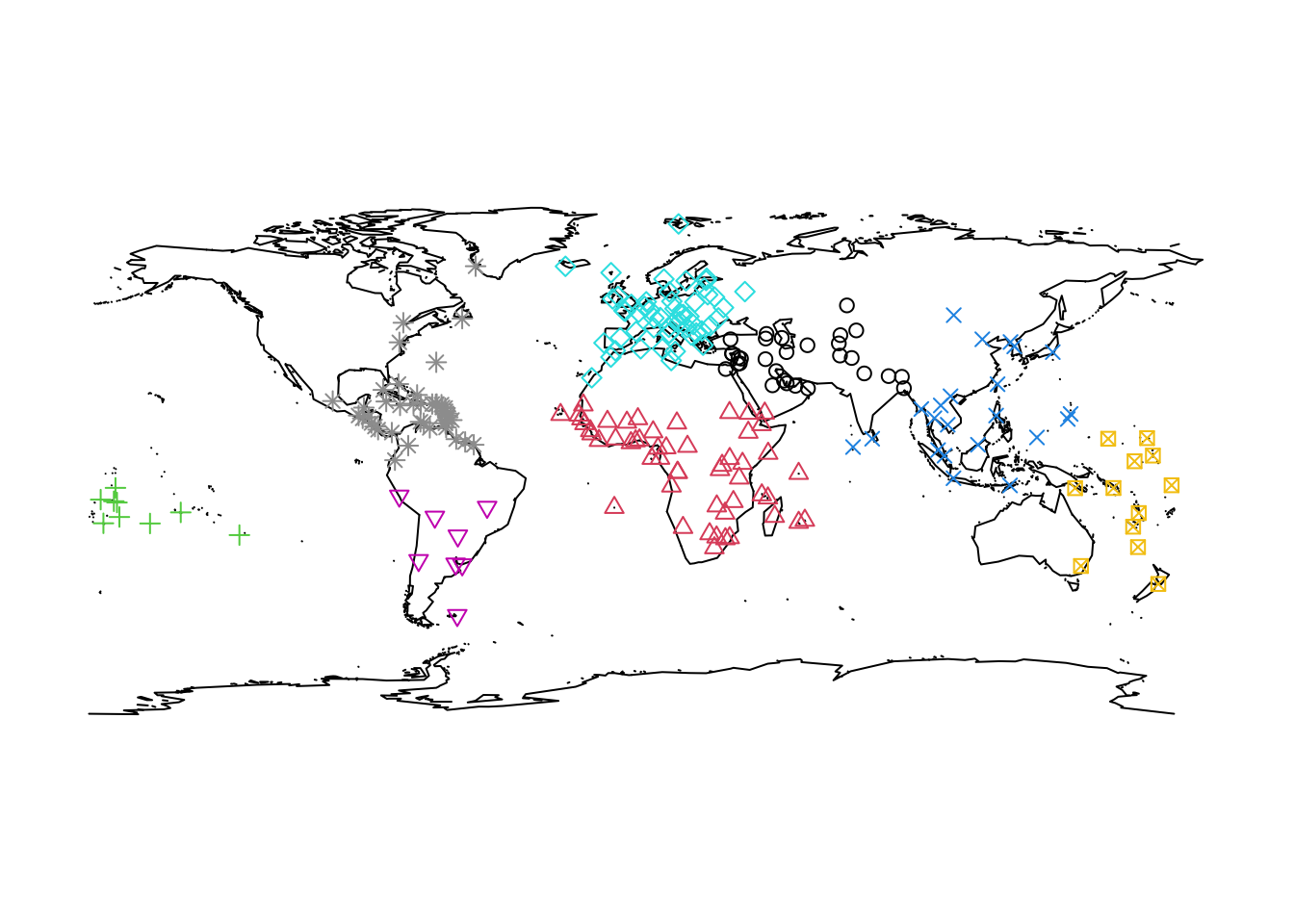 points(d2[,2],d2[,1],col=gruppi_8,pch=gruppi_8)