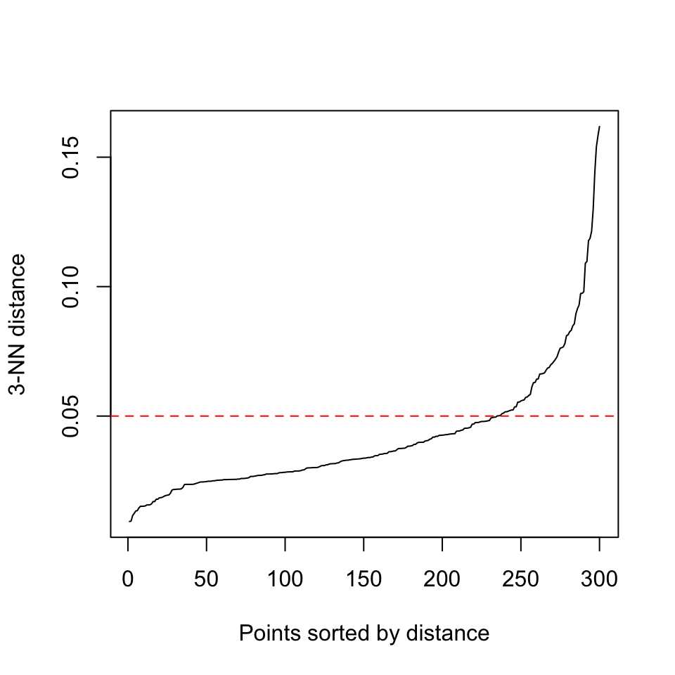 Il valore predefinito per MinPts nella funzione dbscan è 5 (usa almeno il numero di dimensioni del set di dati più uno). Per eps, possiamo trovare un valore adatto esplorando un diagramma K-NN dei punti (cioè il diagramma delle distanze al k-esimo vicino più vicino in ordine decrescente) e cercare un angolo acuto nel diagramma: