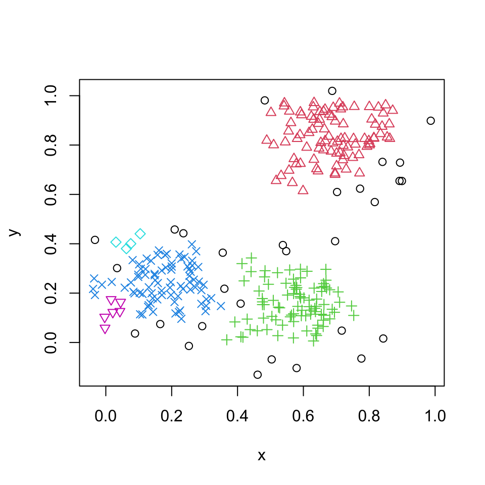 La funzione R per implementare il metodo DBSCAN è la funzione dbscan nel pacchetto dbscan. Per illustrare come funziona l’algoritmo, simuleremo prima tre cluster nello spazio bidimensionale con 100 punti ciascuno: