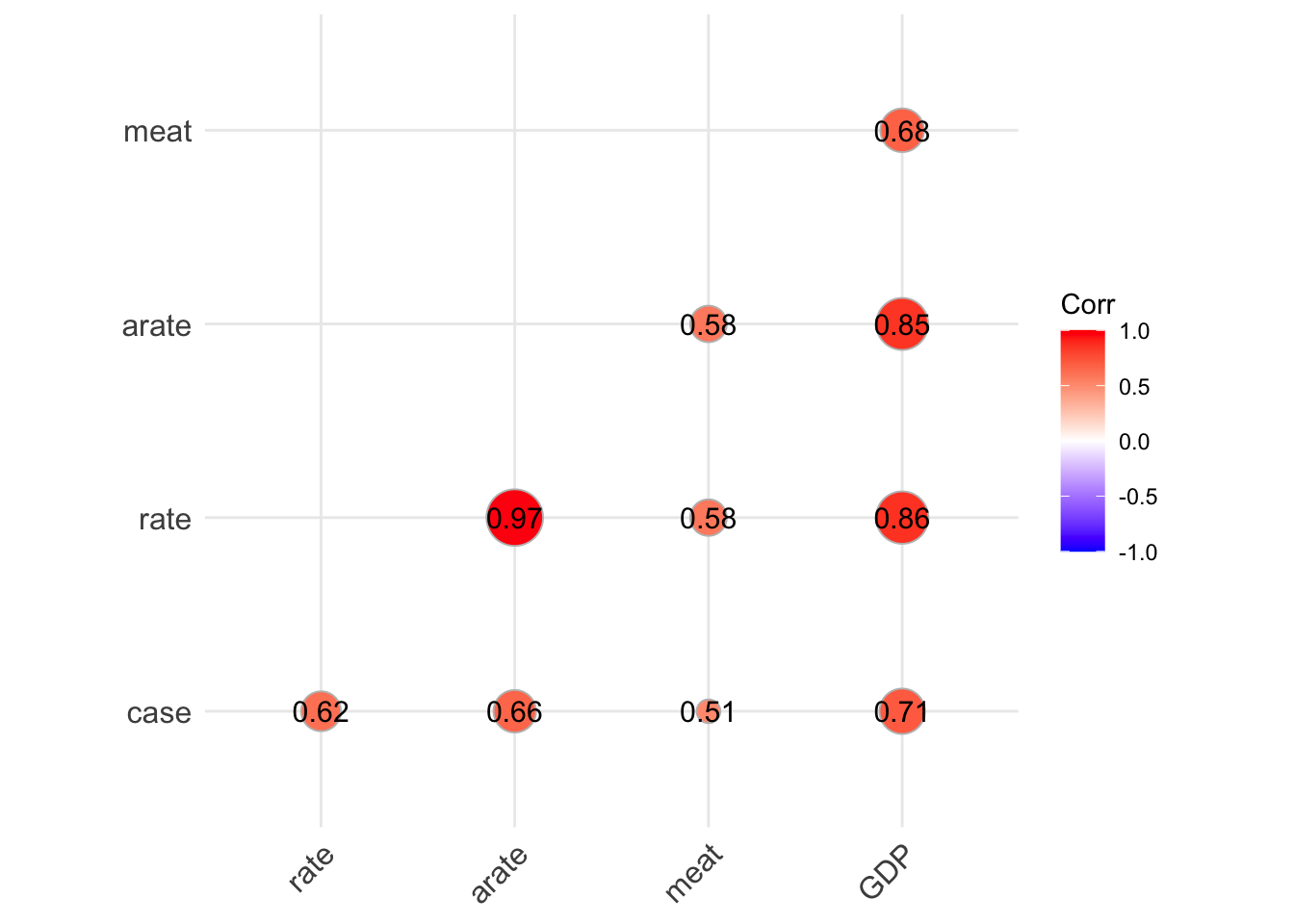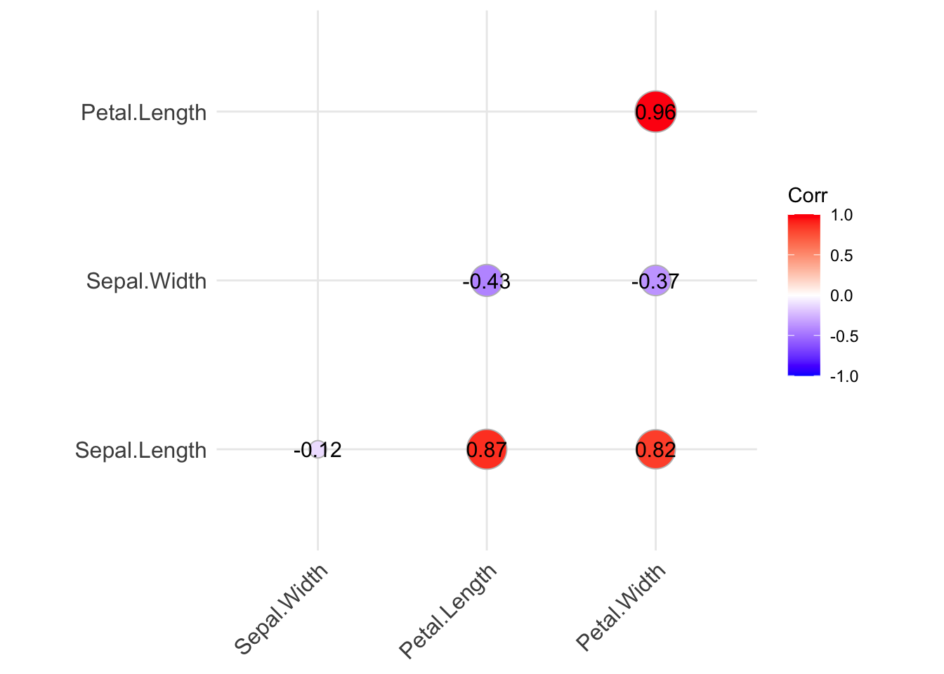 ggcorrplot(cor(iris[,-5]),type="lower", method="circle", lab=TRUE)