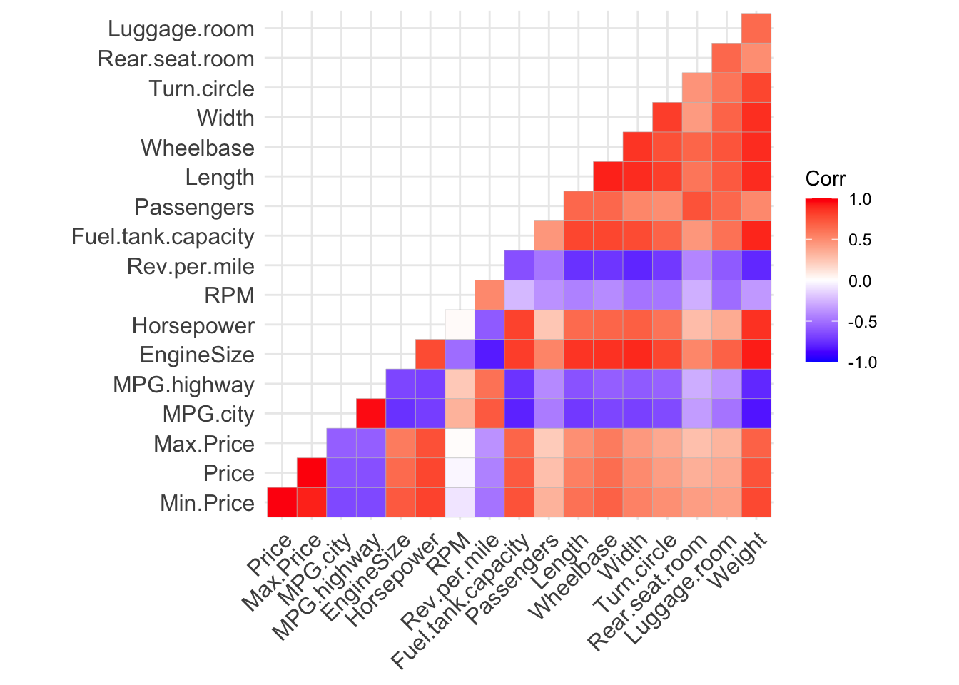 corrcar<-round(cor(Cars93num, use = "complete.obs", method="pearson"),2)
