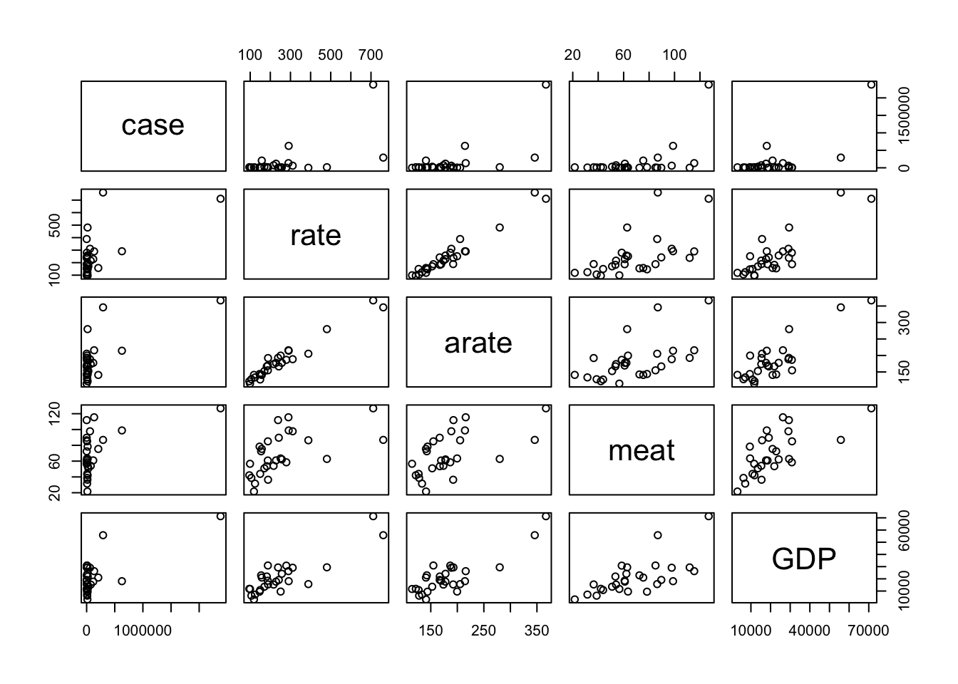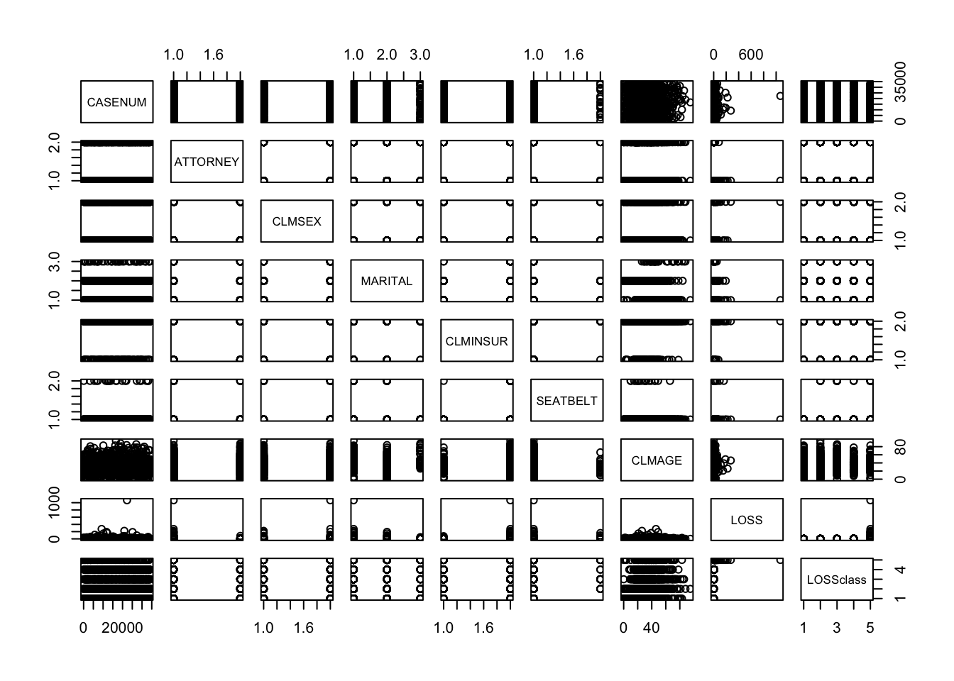 Un altra utile funzione per verificare le relazioni fra tutte le variabili, senza calcolare il coefficiente di correlazione ma rappresentando come in una matrice di correlazione tutti gli scatterplot delle coppie, è la funzione pairs()
