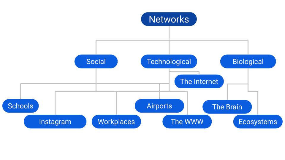 Given this very broad definition, it should start to dawn on you why people think that networks are everywhere. Any system of interacting parts or entities can be depicted and analyzed as a network. That is why the idea of a network cuts across the human (e.g., networks of words in a text), social (networks of students in a school), physical (networks of computers in the internet) and biological (networks of neurons in the brain) sciences. Figure 0.2 gives you an idea of the different types of networked systems that exist in the world.