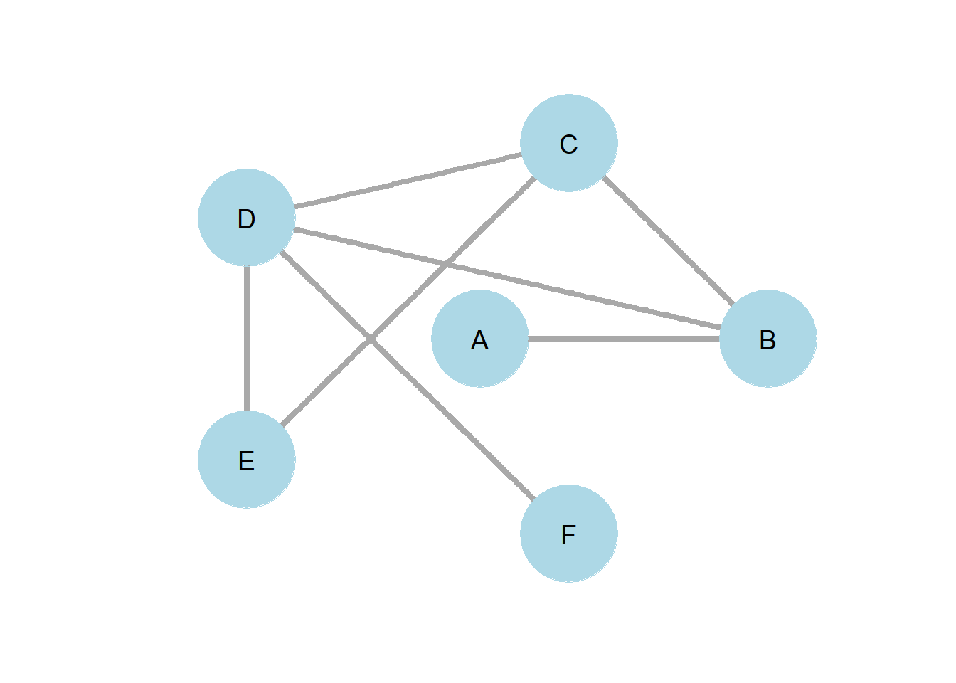 Figure 4.1 provides a simple example of how k-path centrality of two provides insights that degree centrality alone fails to provide. Nodes A and F both have a degree centrality of one. However, node F has a 2-path centrality of 3, while node A has a 2-path centrality of 2. We might then think of node F as better connected to the network than node A.