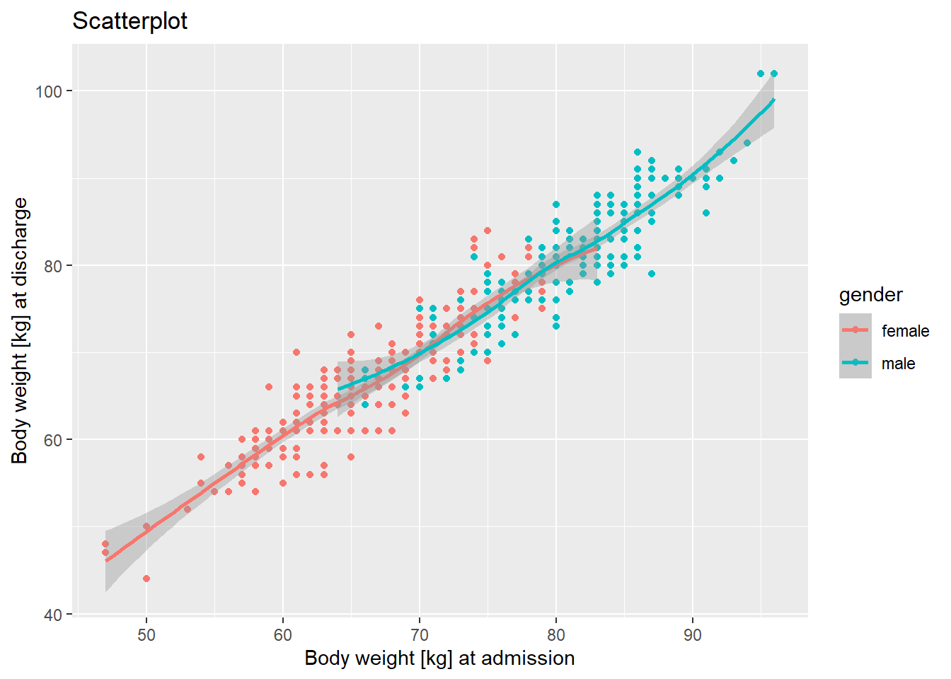 geom_smooth(aes(x = weight_admission, y = weight_discharge, color = gender))