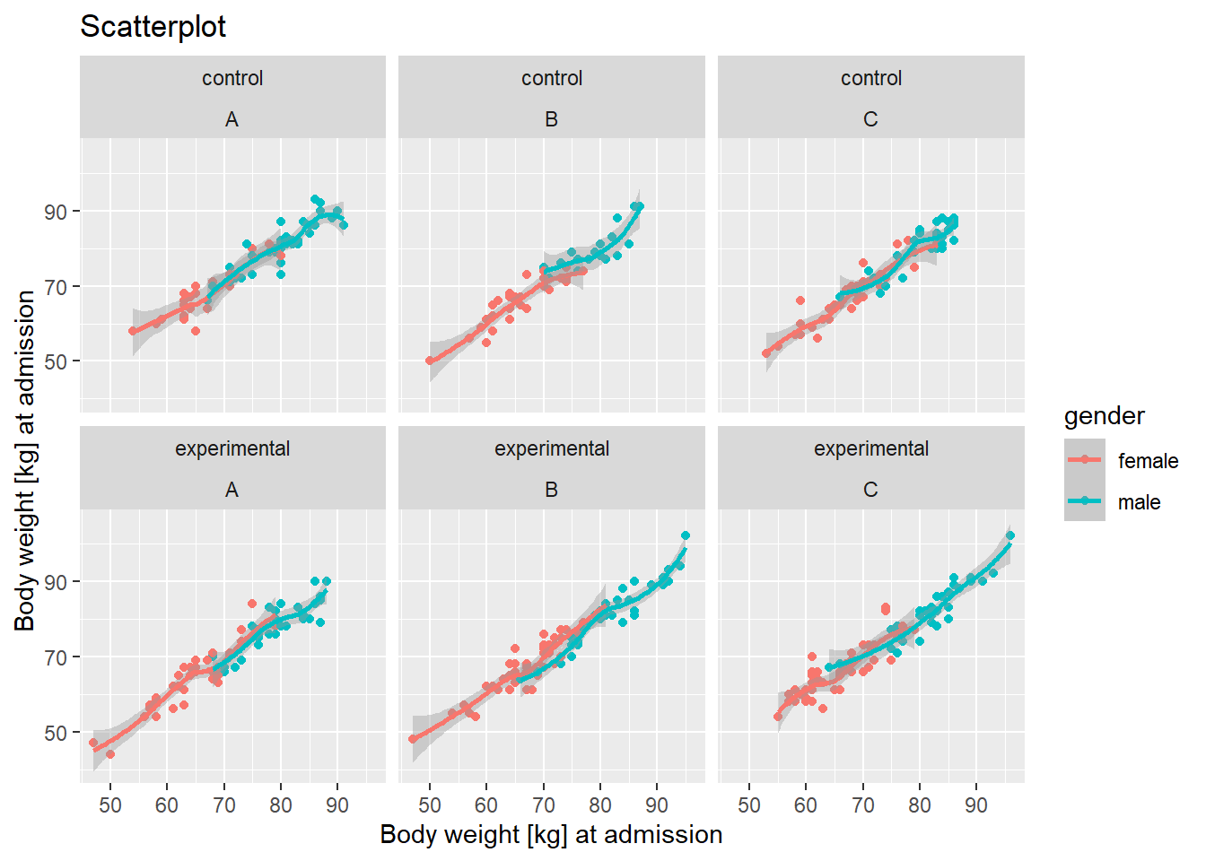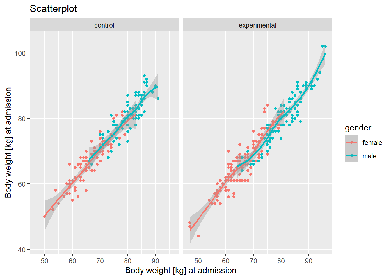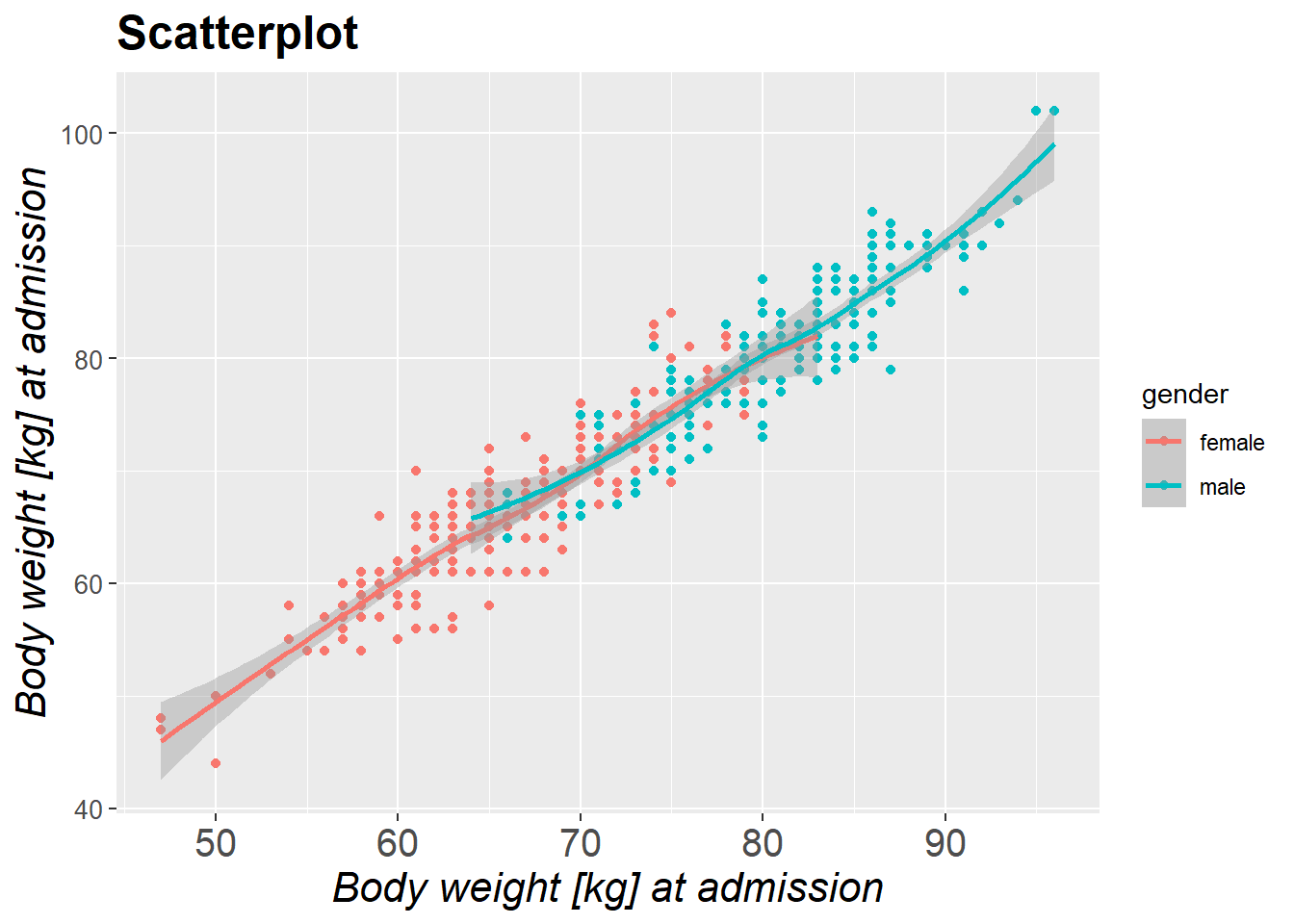 Starting with a simple graphic, we want to draw a scatterplot of the body weight at admission and at discharge. In ggplot, we build a graphics object and save it as a variable that is only actually drawn if we call it in the console. We start by laying out a white sheet and call our graphic my_plot: