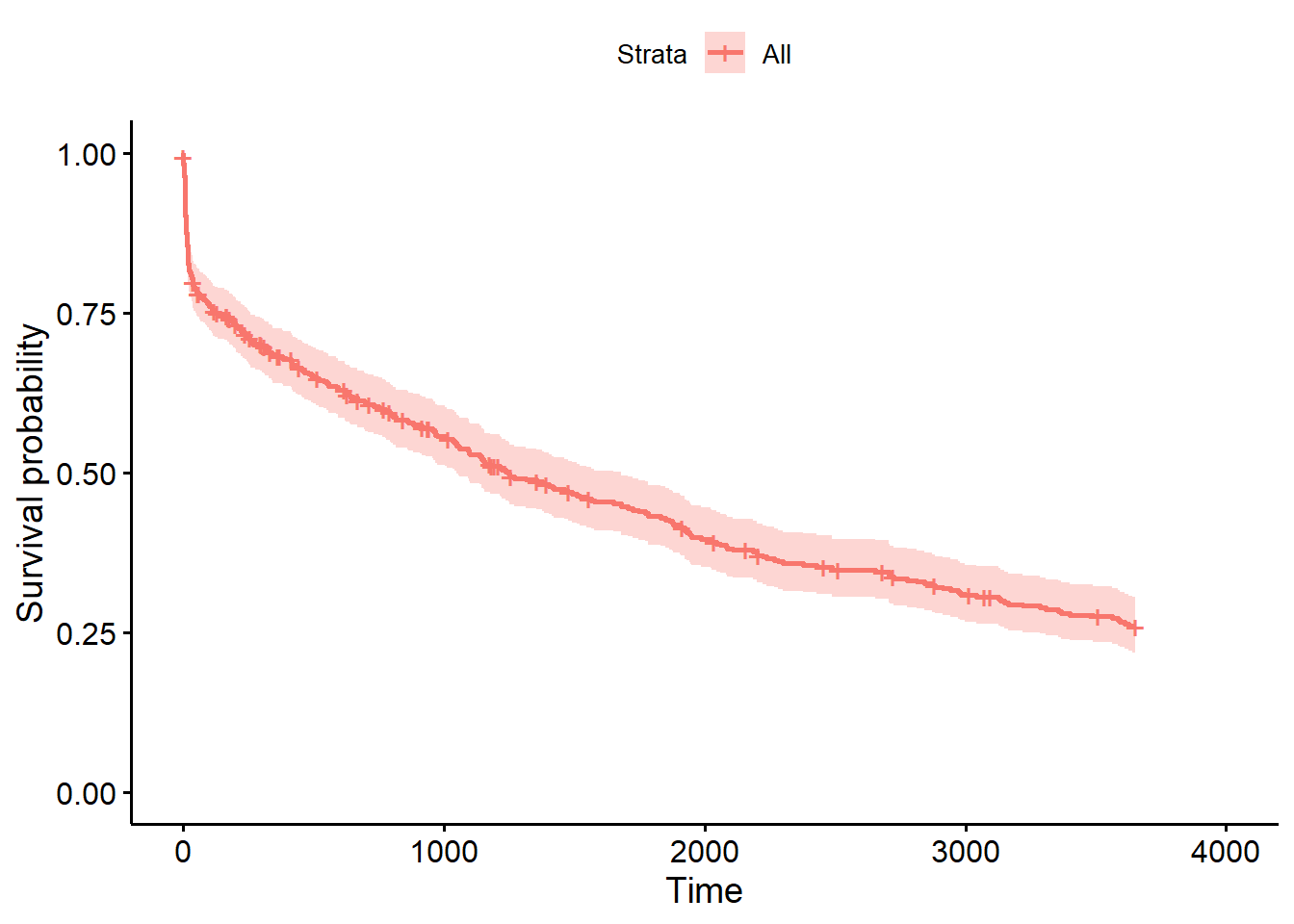 It is also possible to look at the Kaplan-Meier estimates as numbers directly by calling summary(sf_treat), but because the output is rather long, we will not print it here.