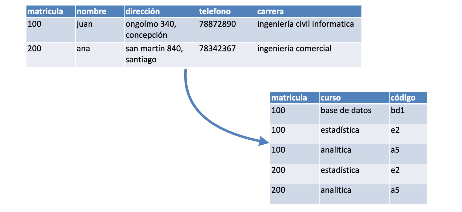Es imperativo mantener la unicidad de los valores de los atributos/columnas. En que si bien la solución inicial puede ser duplicar el registro/tupla para contener la información adicional, no es una medida aceptada. Otra opción aparente sería agregar curso 1 y curso 2. Al igual que lo indicado en la figura siguiente permtiría atributos en blanco o nulos.