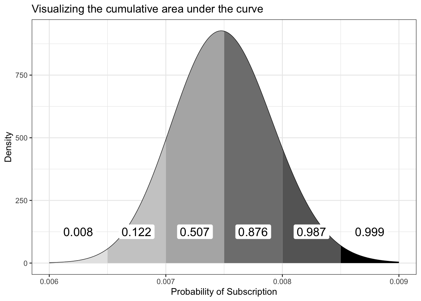 x_lower<-seq(0.006, 0.0085, 0.0005)x_upper<-seq(0.0065, 0.009, 0.0005)text_pos<-seq(0.00625, 0.00875, 0.0005)colors<-c("gray90", "gray80", "gray70", "gray50", "gray40", "black")df_13_2<-tibble::tibble(x =seq(0.006, 0.009, length.out =6000), y =dbeta(x, 300, 39700))ggplot2::ggplot(df_13_2, ggplot2::aes(x =x, y =y))+ggplot2::geom_line()+ggplot2::geom_area(data =df_13_2|>dplyr::filter(x>=x_lower[1]&x<x_upper[1]), fill =colors[1])+ggplot2::annotate(geom ="label", x =text_pos[1], size =5, y =125, color ="black", fill ="white", label.size =NA, label =round(integrate(function(x)dbeta(x, 300, 39700), x_lower[1], x_upper[1])[["value"]], 3))+ggplot2::geom_area(data =df_13_2|>dplyr::filter(x>=x_lower[2]&x<x_upper[2]), fill =colors[2])+ggplot2::annotate(geom ="label", x =text_pos[2], size =5, y =125, color ="black", fill ="white", label.size =NA, label =round(integrate(function(x)dbeta(x, 300, 39700), x_lower[1], x_upper[2])[["value"]], 3))+ggplot2::geom_area(data =df_13_2|>dplyr::filter(x>=x_lower[3]&x<x_upper[3]), fill =colors[3])+ggplot2::annotate(geom ="label", x =text_pos[3], size =5, y =125, color ="black", fill ="white", label.size =NA, label =round(integrate(function(x)dbeta(x, 300, 39700), x_lower[1], x_upper[3])[["value"]], 3))+ggplot2::geom_area(data =df_13_2|>dplyr::filter(x>=x_lower[4]&x<x_upper[4]), fill =colors[4])+ggplot2::annotate(geom ="label", x =text_pos[4], size =5, y =125, color ="black", fill ="white", label.size =NA, label =round(integrate(function(x)dbeta(x, 300, 39700), x_lower[1], x_upper[4])[["value"]], 3))+ggplot2::geom_area(data =df_13_2|>dplyr::filter(x>=x_lower[5]&x<x_upper[5]), fill =colors[5])+ggplot2::annotate("label", x =text_pos[5], size =5, y =125, color ="black", fill ="white", label.size =NA, label =round(integrate(function(x)dbeta(x, 300, 39700), x_lower[1], x_upper[5])[["value"]], 3))+ggplot2::geom_area(data =df_13_2|>dplyr::filter(x>=x_lower[6]&x<x_upper[6]), fill =colors[6])+ggplot2::annotate(geom ="label", x =text_pos[6], size =5, y =125, color ="black", fill ="white", label.size =NA, label =round(integrate(function(x)dbeta(x, 300, 39700), x_lower[1], x_upper[6])[["value"]], 3))+ggplot2::theme_bw()+ggplot2::labs( title ="Visualizing the cumulative area under the curve", x ="Probability of Subscription", y ="Density")