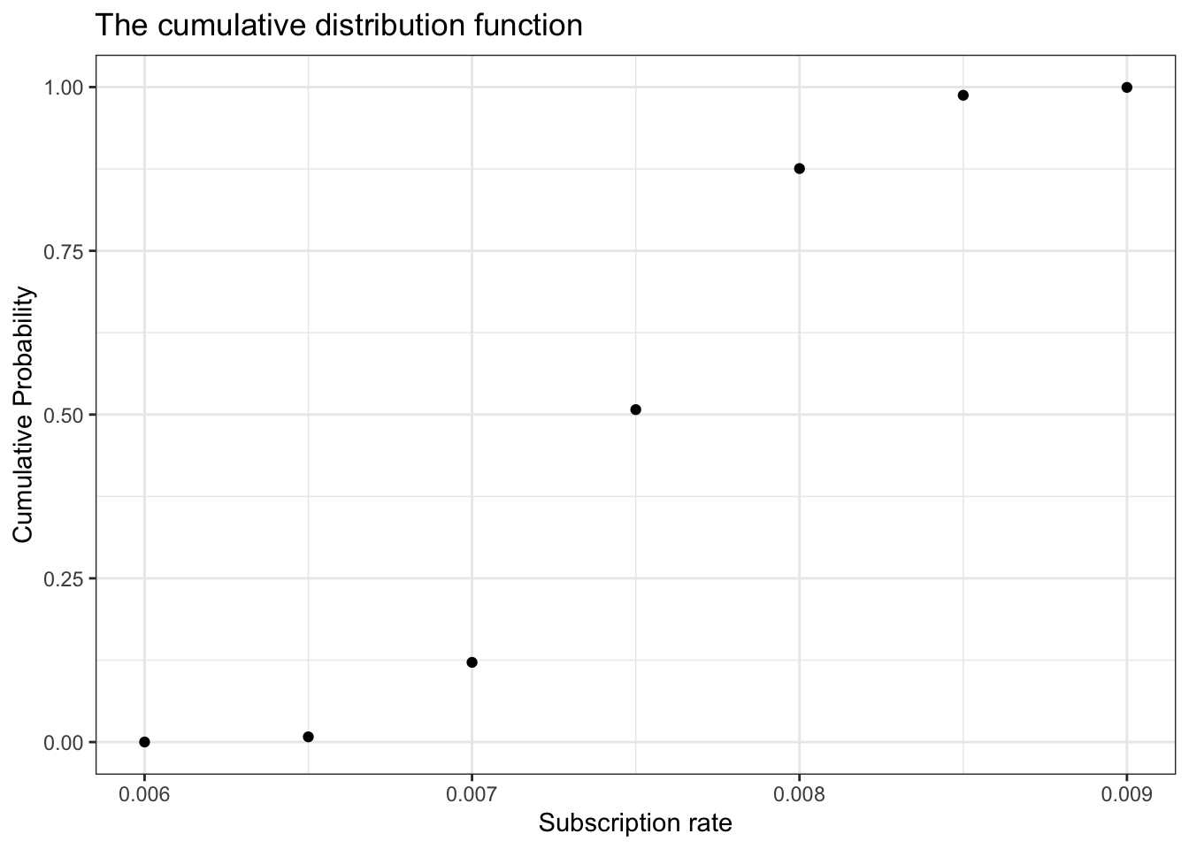 df_13_3<-tibble::tibble(x =seq(0.006, 0.009, 0.0005), y =pbeta(x, 300, 39700))ggplot2::ggplot(df_13_3, ggplot2::aes(x =x, y =y))+ggplot2::geom_point()+ggplot2::theme_bw()+ggplot2::labs( title ="The cumulative distribution function", x ="Subscription rate", y ="Cumulative Probability")