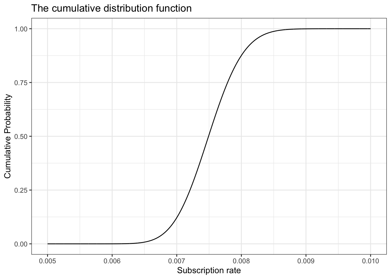 df_13_4a<-tibble::tibble(x =seq(0.005, 0.01, 1e-6), y =pbeta(x, 300, 39700))ggplot2::ggplot(df_13_4a, ggplot2::aes(x =x, y =y))+ggplot2::geom_line()+ggplot2::theme_bw()+ggplot2::labs( title ="The cumulative distribution function", x ="Subscription rate", y ="Cumulative Probability")