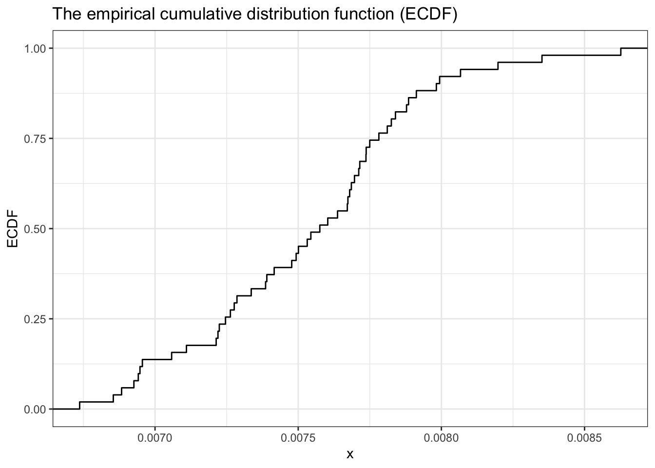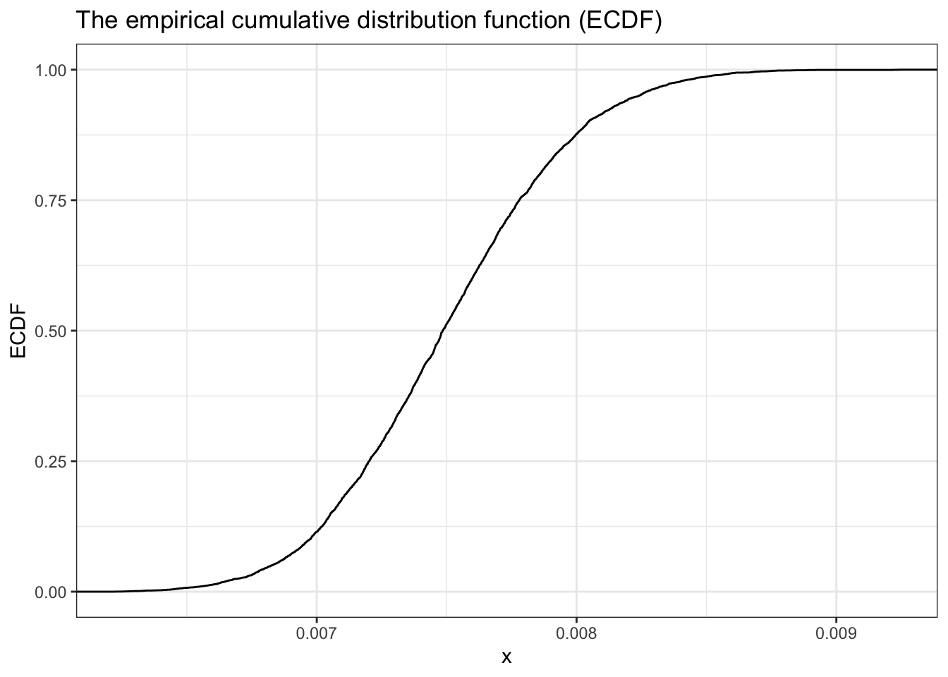 df_13_4d<-tibble::tibble(x =seq(0.005, 0.01, 1e-6), y =rbeta(x, 300, 39700))ggplot2::ggplot(df_13_4d, ggplot2::aes(y))+ggplot2::stat_ecdf(geom ="step")+ggplot2::theme_bw()+ggplot2::labs( title ="The empirical cumulative distribution function (ECDF)", x ="x", y ="ECDF")