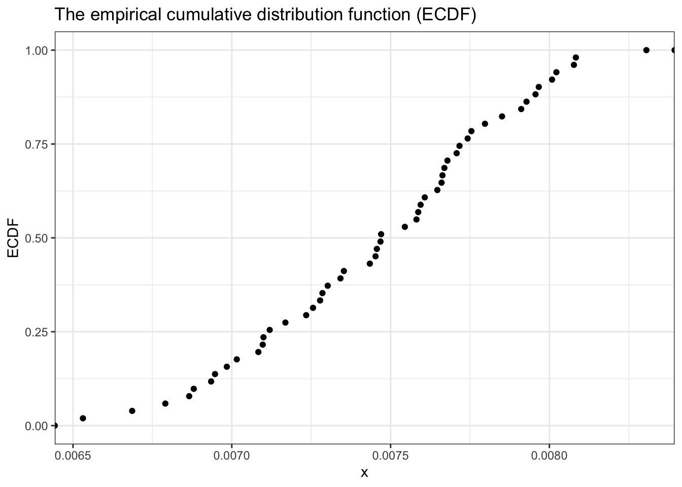 df_13_4c<-tibble::tibble(x =seq(0.005, 0.01, 1e-4), y =rbeta(x, 300, 39700))ggplot2::ggplot(df_13_4c, ggplot2::aes(y))+ggplot2::stat_ecdf(geom ="point")+ggplot2::theme_bw()+ggplot2::labs( title ="The empirical cumulative distribution function (ECDF)", x ="x", y ="ECDF")