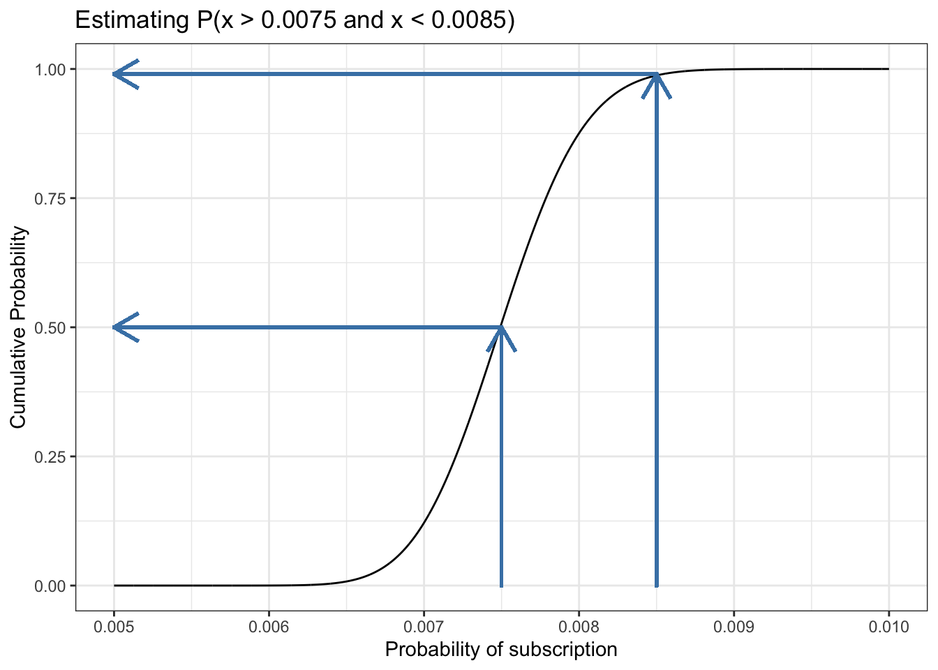 df_13_6<-tibble::tibble(x =seq(0.005, 0.01, 1e-6), y =pbeta(x, 300, 39700))ggplot2::ggplot(df_13_6, ggplot2::aes(x =x, y =y))+ggplot2::geom_line()+ggplot2::geom_segment(ggplot2::aes(xend =0.005, yend =0.50, x =0.00750, y =0.50), lineend ="square", linejoin ="bevel", color ="steelblue", size =0.8, arrow =ggplot2::arrow(length =ggplot2::unit(0.5, "cm")))+ggplot2::geom_segment(ggplot2::aes(xend =0.0075, yend =0.50, x =0.0075, y =0.00), lineend ="square", linejoin ="bevel", color ="steelblue", size =0.8, arrow =ggplot2::arrow(length =ggplot2::unit(0.5, "cm")))+ggplot2::geom_segment(ggplot2::aes(x =0.0085, y =0, xend =0.0085, yend =0.99), lineend ="square", linejoin ="bevel", color ="steelblue", size =0.8, arrow =ggplot2::arrow(length =ggplot2::unit(0.5, "cm")))+ggplot2::geom_segment(ggplot2::aes(x =0.0085, y =0.99, xend =0.005, yend =0.99), lineend ="square", linejoin ="bevel", color ="steelblue", size =0.8, arrow =ggplot2::arrow(length =ggplot2::unit(0.5, "cm")))+ggplot2::theme_bw()+ggplot2::labs( title ="Estimating P(x > 0.0075 and x < 0.0085)", x ="Probability of subscription", y ="Cumulative Probability")