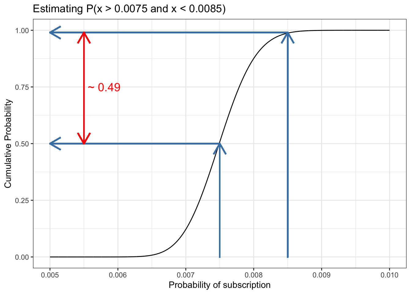 df_13_6<-tibble::tibble(x =seq(0.005, 0.01, 1e-6), y =pbeta(x, 300, 39700))ggplot2::ggplot(df_13_6, ggplot2::aes(x =x, y =y))+ggplot2::geom_line()+ggplot2::geom_segment(ggplot2::aes(xend =0.005, yend =0.50, x =0.00750, y =0.50), lineend ="square", linejoin ="bevel", color ="steelblue", size =0.8, arrow =ggplot2::arrow(length =ggplot2::unit(0.5, "cm")))+ggplot2::geom_segment(ggplot2::aes(xend =0.0075, yend =0.50, x =0.0075, y =0.00), lineend ="square", linejoin ="bevel", color ="steelblue", size =0.8, arrow =ggplot2::arrow(length =ggplot2::unit(0.5, "cm")))+ggplot2::geom_segment(ggplot2::aes(x =0.0085, y =0, xend =0.0085, yend =0.99), lineend ="square", linejoin ="bevel", color ="steelblue", size =0.8, arrow =ggplot2::arrow(length =ggplot2::unit(0.5, "cm")))+ggplot2::geom_segment(ggplot2::aes(x =0.0085, y =0.99, xend =0.005, yend =0.99), lineend ="square", linejoin ="bevel", color ="steelblue", size =0.8, arrow =ggplot2::arrow(length =ggplot2::unit(0.5, "cm")))+ggplot2::geom_segment(ggplot2::aes(x =0.0055, y =0.5, xend =0.0055, yend =0.99), lineend ="square", linejoin ="bevel", color ="red", size =0.8, arrow =ggplot2::arrow(length =ggplot2::unit(0.5, "cm")))+ggplot2::geom_segment(ggplot2::aes(xend =0.0055, yend =0.5, x =0.0055, y =0.99), lineend ="square", linejoin ="bevel", color ="red", size =0.8, arrow =ggplot2::arrow(length =ggplot2::unit(0.5, "cm")))+ggplot2::annotate("text", x =0.0058, y =0.75, label ="~ 0.49", color ="red", size =5)+ggplot2::theme_bw()+ggplot2::labs( title ="Estimating P(x > 0.0075 and x < 0.0085)", x ="Probability of subscription", y ="Cumulative Probability")