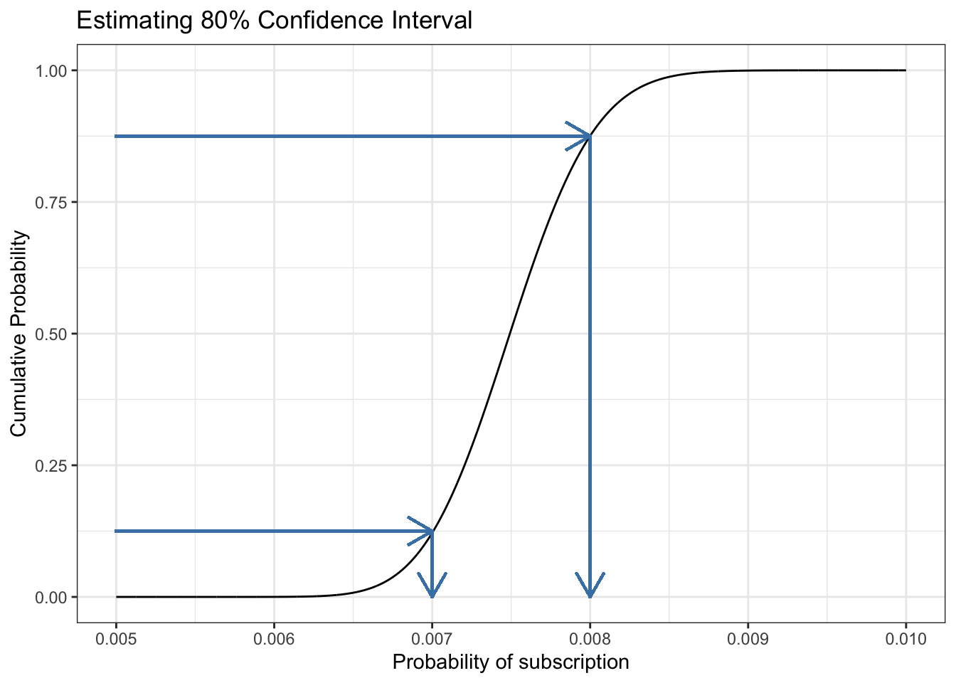 df_13_7<-tibble::tibble(x =seq(0.005, 0.01, 1e-6), y =pbeta(x, 300, 39700))ggplot2::ggplot(df_13_7, ggplot2::aes(x =x, y =y))+ggplot2::geom_line()+ggplot2::geom_segment(ggplot2::aes(xend =0.007, yend =0.125, x =0.005, y =0.125), lineend ="square", linejoin ="bevel", color ="steelblue", size =0.6, arrow =ggplot2::arrow(length =ggplot2::unit(0.5, "cm")))+ggplot2::geom_segment(ggplot2::aes(xend =0.0080, yend =0.875, x =0.005, y =0.875), lineend ="square", linejoin ="bevel", color ="steelblue", size =0.6, arrow =ggplot2::arrow(length =ggplot2::unit(0.5, "cm")))+ggplot2::geom_segment(ggplot2::aes(x =0.007, y =0.125, xend =0.007, yend =0.0), lineend ="square", linejoin ="bevel", color ="steelblue", size =0.6, arrow =ggplot2::arrow(length =ggplot2::unit(0.5, "cm")))+ggplot2::geom_segment(ggplot2::aes(x =0.008, y =0.875, xend =0.008, yend =0.0), lineend ="square", linejoin ="bevel", color ="steelblue", size =0.6, arrow =ggplot2::arrow(length =ggplot2::unit(0.5, "cm")))+ggplot2::theme_bw()+ggplot2::labs( title ="Estimating 80% Confidence Interval", x ="Probability of subscription", y ="Cumulative Probability")