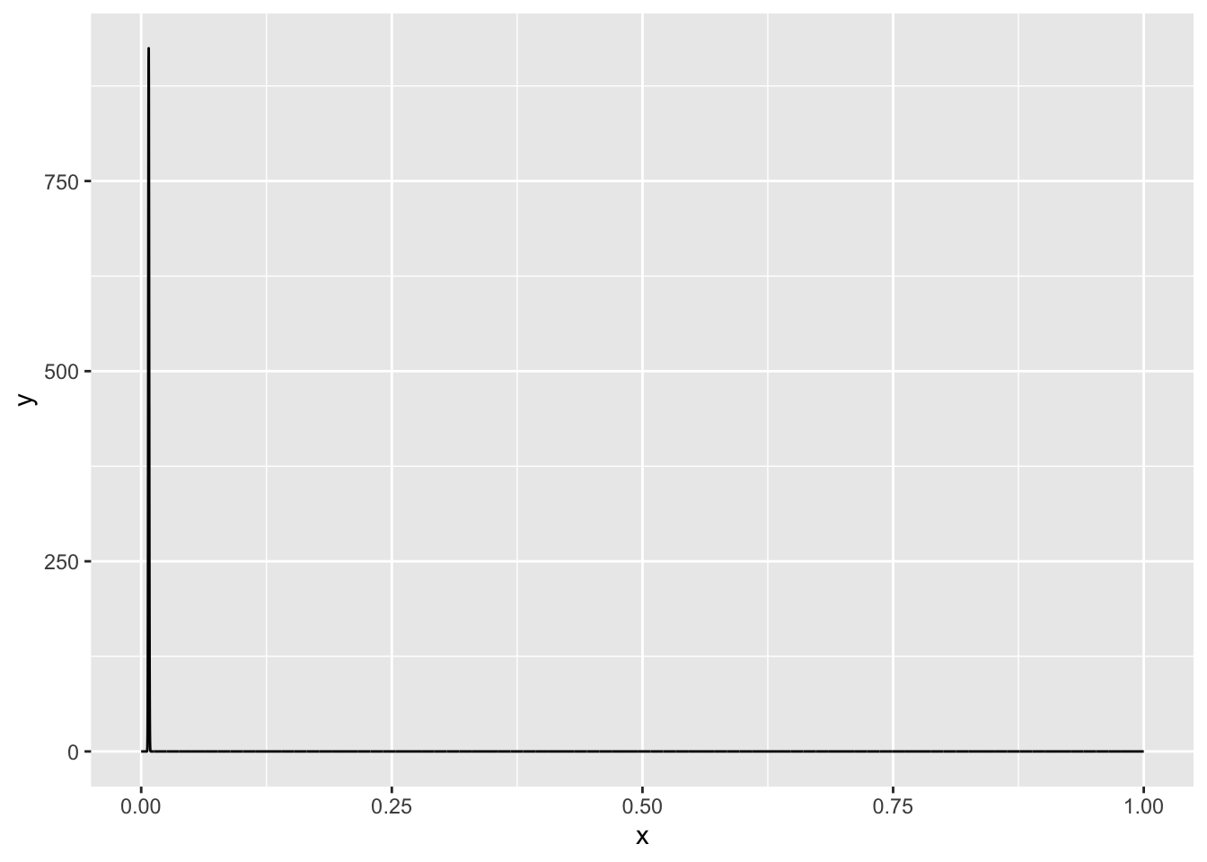 The problem here is that the interesting part of the PDF is very small as we know from the \(\frac{300}{40000} = 0.0075\). Therefore it does not make sense to spread the grid from 0 to 1. We get a much better visualization in the area 0 to 001: