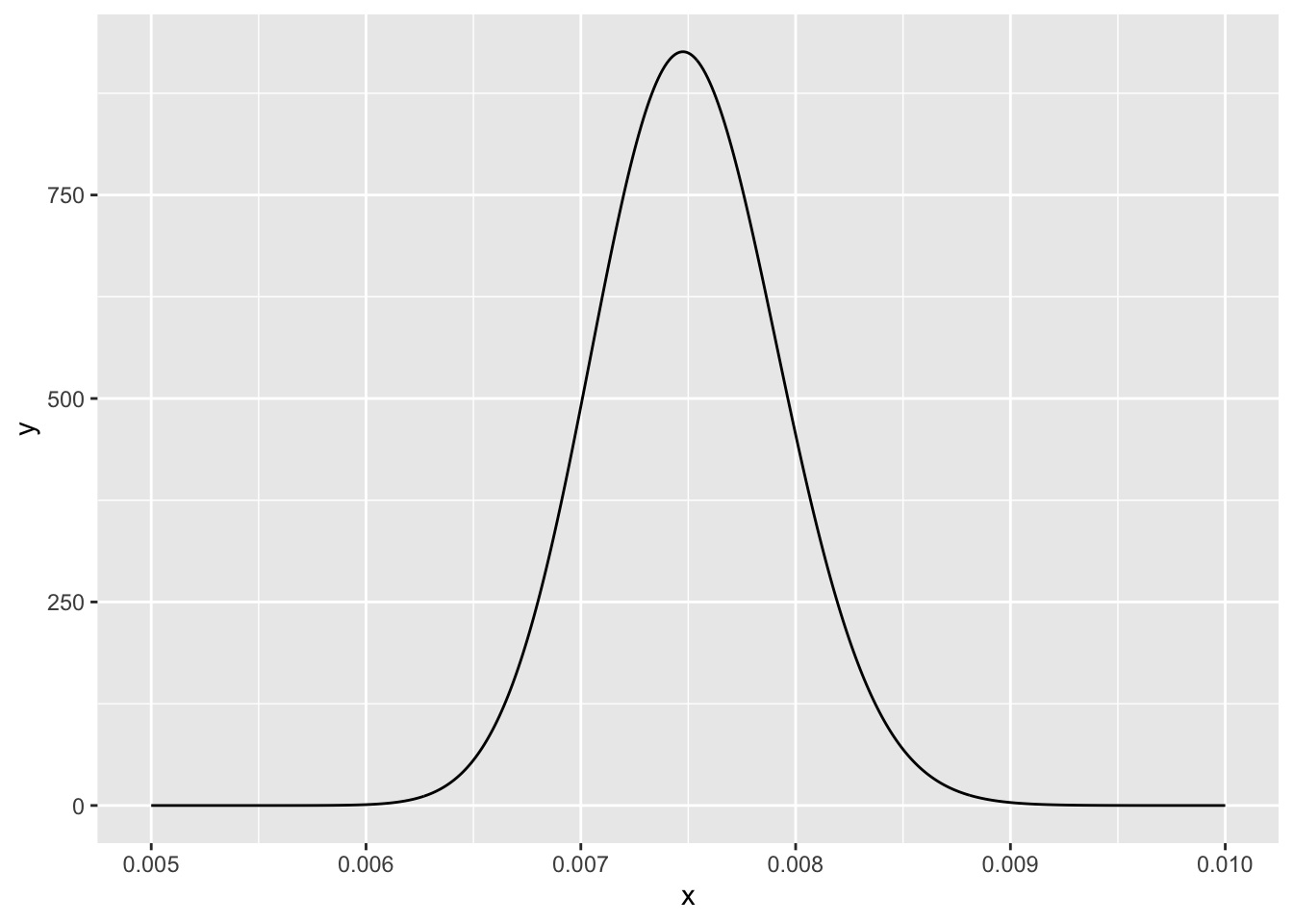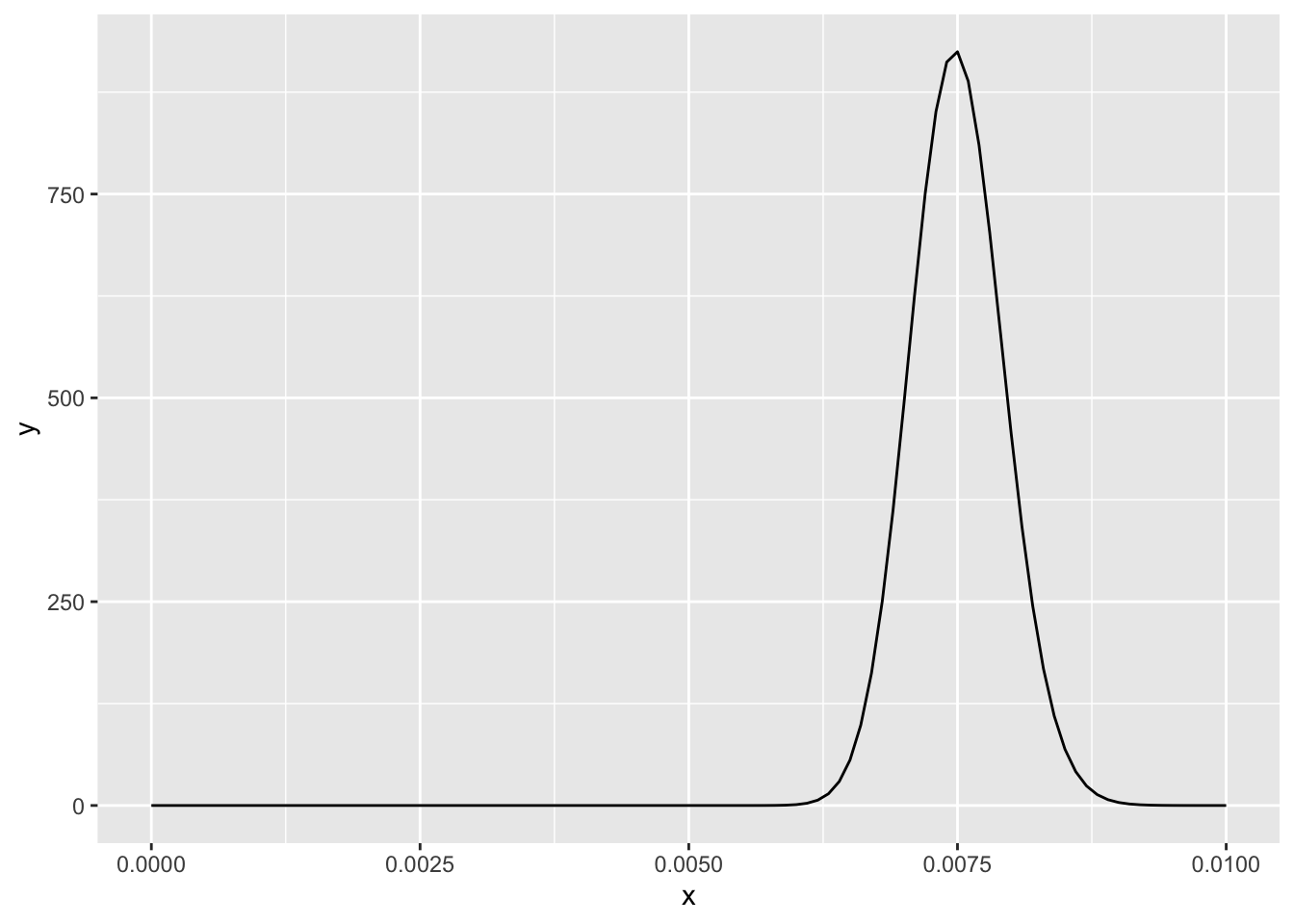 tibble::tibble(x =seq(0.005, 0.01, .00001), y =dbeta(x, 300, 39700))|>ggplot2::ggplot(ggplot2::aes(x =x, y =y))+ggplot2::geom_line()