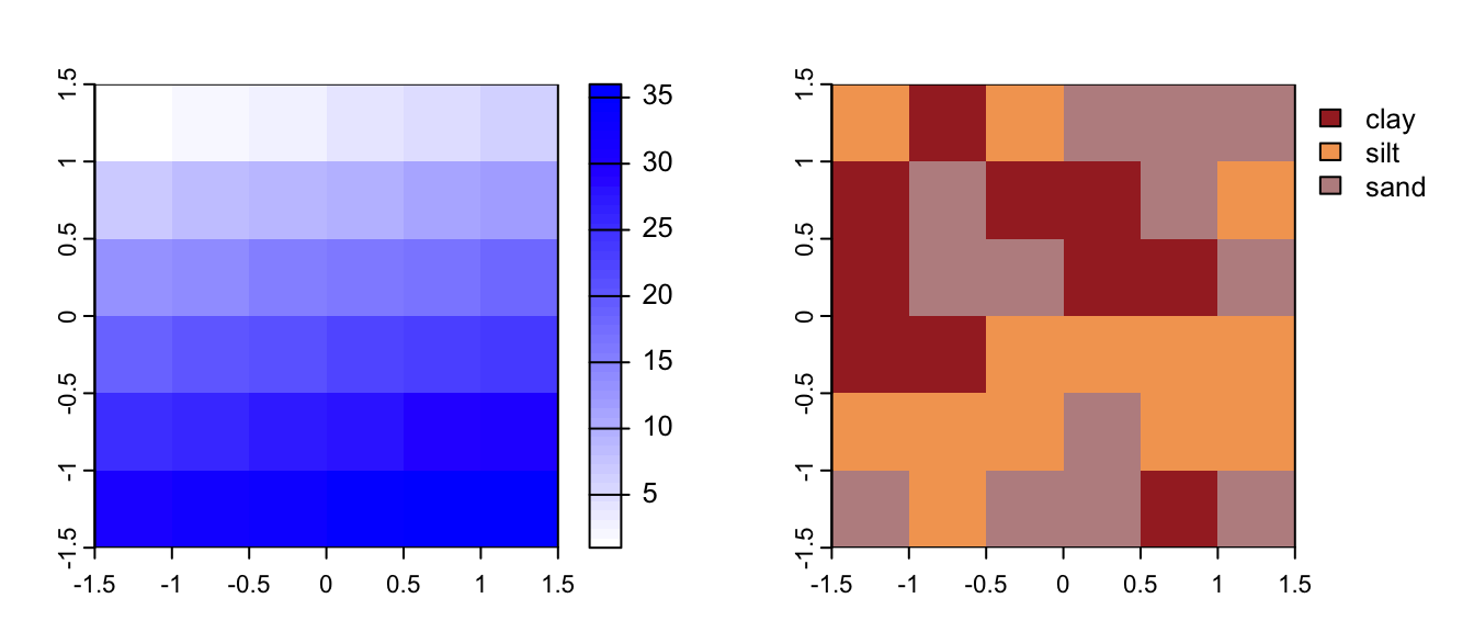 Figure 3.1: Raster datasets with numeric (left) and categorical values (right).