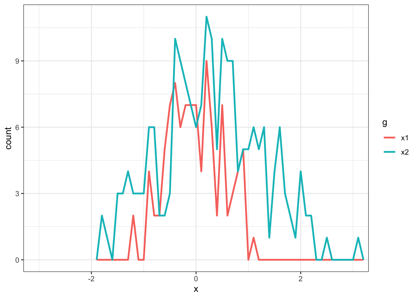 freqpoly<-function(x1, x2, binwidth=0.1, xlim=c(-3, 3)){df<-base::data.frame( x =base::c(x1, x2), g =base::c(base::rep("x1", base::length(x1)), base::rep("x2", base::length(x2))))ggplot2::ggplot(df, ggplot2::aes(x, colour =g))+ggplot2::geom_freqpoly(binwidth =binwidth, linewidth =1)+ggplot2::coord_cartesian(xlim =xlim)}t_test<-function(x1, x2){test<-stats::t.test(x1, x2)# use sprintf() to format t.test() results compactlybase::sprintf("p value: %0.3f\n[%0.2f, %0.2f]",test$p.value, test$conf.int[1], test$conf.int[2])}### prepare valuesx1<-stats::rnorm(100, mean =0, sd =0.5)x2<-stats::rnorm(200, mean =0.15, sd =0.9)### call functionsfreqpoly(x1, x2)base::cat(t_test(x1, x2))