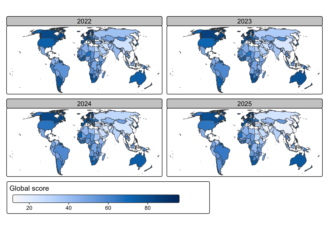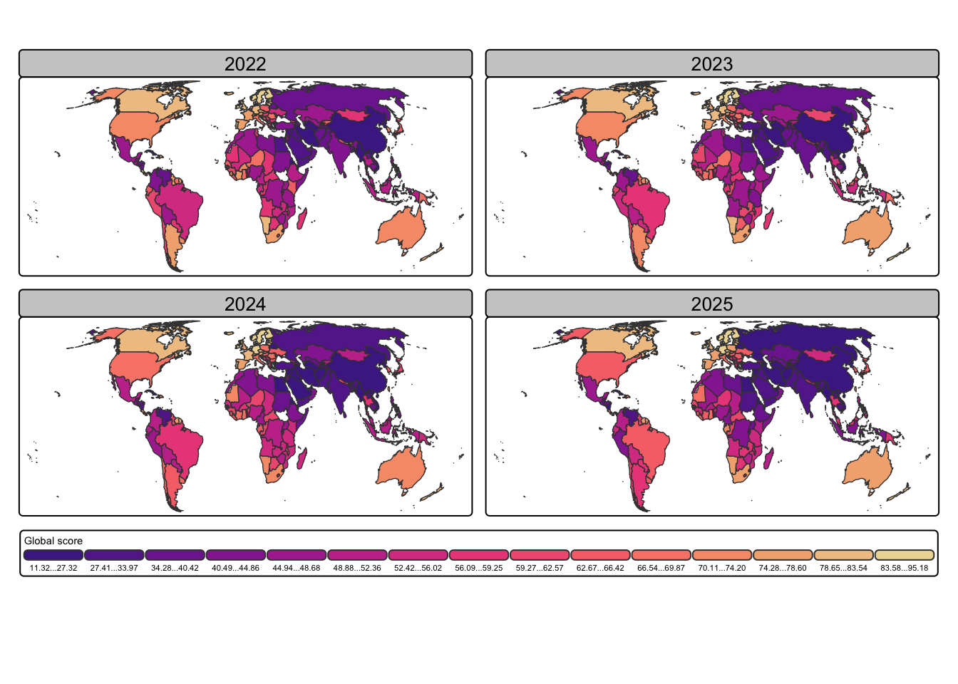 Therefore I tried it with the continuous scale for the score values as used in Graph 2.1. But again: The small score differences between the four years are not visible because the changes in the color shades are too tiny. If you compare the colors of Argentina in 2022 and 2025 then you will see a substantial deterioration from a 77 to the score of 56. But even with this tremendous difference — where Argentina drops from the rank 29 to the rank 87 — one has difficulty to notice immediately the different color shade.