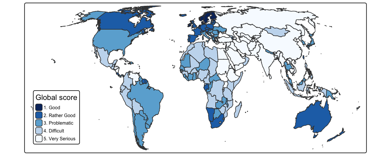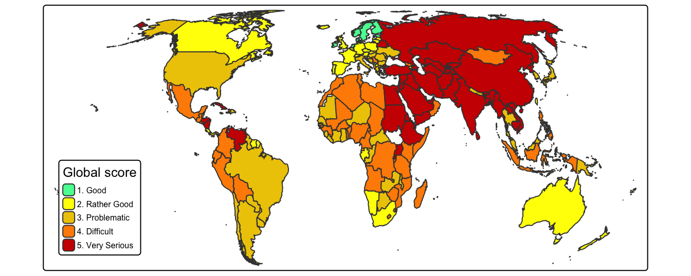 # Plot map with {tmap} {#sec-chap041}::::: {#obj-chap041}:::: {.my-objectives}::: {.my-objectives-header}Objectives:::::: {.my-objectives-container}Plot the `r glossary("WPFI")` country distribution with an interactive map.::::::::::::## Introduction:::::{.my-resource}:::{.my-resource-header}:::::: {#lem-041-map-plotting}: Map plotting:::::::::::::{.my-resource-container}I have my notes how to plot maps distributed over several places:- [Vector Geospatial Data](https://bookdown.org/pbaumgartner/gdswr-notes-new/05-vector-geospatial-data.html) explains in [Chapter 5](https://bookdown.org/mcwimberly/gdswr-book/vector-geospatial-data.html) of Geographic Datascience with R (GDSR) [@wimberly-2022; @wimberly-2023; @wimberly-2023a] map plotting with the `ggplot2::geom_sf()` in combination with {**sf**}, but also describes previous important procedures with shapefiles and {**sp**} (the predecessor of {**sf**}.- [Creating Maps](https://bookdown.org/pbaumgartner/gdswr-notes-new/91-creating-maps.html) is an appendix to my notes on the GSDR book. It covers two tutorials: The article by [@felixanalytix-2023] and video [@felixanalytix-2023a]. It uses `ggplot2::geom_sf()` to draw the maps and explains several important procedures like - choosing `adm0_a3` for the [correct ISO country code](https://bookdown.org/pbaumgartner/gdswr-notes-new/91-creating-maps.html#plotting-a-world-map) - [changing the world map projection](https://bookdown.org/pbaumgartner/gdswr-notes-new/91-creating-maps.html#changing-world-map-projection) - [zooming into a specific area](https://bookdown.org/pbaumgartner/gdswr-notes-new/91-creating-maps.html#zooming-into-a-specific-area) - [changing scale and color distribution](https://bookdown.org/pbaumgartner/gdswr-notes-new/91-creating-maps.html#changing-scale-and-color-distribution)- [Interactive Choroploth Maps](https://bookdown.org/pbaumgartner/gdswr-notes-new/92-interactive-maps.html) uses the {**plotly**} tutorial in [Choropleth maps in R](https://plotly.com/r/choropleth-maps/).- [Working With Austrian Data](https://bookdown.org/pbaumgartner/gdswr-notes-new/95-austrian-data.html) is looking for Austrian spatial datasets. It plots two Austrian maps, one with the [nine regional boundaries](https://bookdown.org/pbaumgartner/gdswr-notes-new/95-austrian-data.html#lst-annex-d-plot-regions) and one with the detailed [administrative borders](https://bookdown.org/pbaumgartner/gdswr-notes-new/95-austrian-data.html#lst-annex-d-austrian-regions-with-admin-borders).- [Making Maps with R](https://bookdown.org/pbaumgartner/geocomputing-notes/09-making-maps.html) is chapter 9 of [Geocomputation with R](https://r.geocompx.org/)[@lovelace-2025]. It covers mainly the use of static, animated and interactive thematic maps with {**tmap**} but has also sections about mapping applications and references to other mapping facilities (like `base::plot()` and `ggplot2::geom_sf()`) and packages (like {**leaflet**}, {**mapsf**}, {**mapview**} and {**ggspatial**}).- [Learn Leaflet](https://bookdown.org/pbaumgartner/geocomputing-notes/97-learn-leaflet.html) covers an introduction to {**leaflet**}, `r glossary("choropleth")` maps, how to show/hide layers and concludes with a case study using the `r glossary("WHR")` data.:::::::::As I am not much experienced with map plottingI am following here closely chapter 9 [Making Maps withR](https://r.geocompx.org/adv-map) respectively chapter 8 of the 2nd edition of the printedbook Geocomputation with R [@lovelace-2025]. The text explains mainly the use of {**tmap**}. I think it is better to know one approach in detail than to have superficial knowledge of several packages. If I have more knowledge and experience in map plotting I will maybe check the other packages to decide which is for my use case the best solution. During the reading of chapter 9 I will focus to generate a world map with my RBW dataset and skip section that are not relevant for this purpose.In additionto the example and code demonstrations I will also use my own`r glossary("RWB")` dataset.## Prepare WPFI data for colored mapBefore I can plot a map with country colors in relation to the press indices I need to join my RWB dataset with the map data from `r glossary("Natural Earth")` (abbreviated in the code with `ne`).:::::{.my-r-code}:::{.my-r-code-header}:::::: {#cnj-041-join-rwb-map}: Join RWB dataset 2022-2025 with the geometry information of the countries:::::::::::::{.my-r-code-container}<center>**Run this code chunk manually if the file(s) still needs to be downloaded.**</center>```{r}#| label: join-rwb-map#| lst-label: lst-041-join-rwb-map#| lst-cap: Prepare dataset for map plotting by joining RWB data 2022-2025 with country data from Natural Earth#| eval: falselibrary(dplyr, warn.conflicts =FALSE)source("R/helper.R")ne_countries_short <-readRDS(paste0(here::here(), "/data/chap023/ne_countries_short.rds")) |>my_as_tibble_sf()rwb_2022_2025 <-readRDS(paste0(here::here(), "/data/chap031/rwb_2022_2025.rds"))rwb_map_2022_2025 <-left_join( rwb_2022_2025, ne_countries_short,by =join_by(iso == adm0_a3))my_save_data_file("chap041", rwb_map_2022_2025, "rwb_map_2022_2025.rds")```***<center>(*For this R code chunk is no output available*)</center>:::::::::By inspecting the dataset manually it turned out that for the following countries do exist RWB data but no geometry:- `r glossary("OECS")`: Organisation of Eastern Caribbean States- Northern Cyprus- Palestine- South Sudan- KosovoI will keep these countries for the and see how their geometry missing is reflected in the world map. If their RWB score will not show up I may delete them from the dataset.There is another issue with Taiwan (TWN): It has RWB scores and geometry data but is lacking `r glossary("UNSD")``r glossary("m49")` regional names. The reason is pressure from China which sees Taiwan as one of their provinces. But for my purpose to show the WPFI for as many countries as possible I will add the missing regional names.:::::{.my-r-code}:::{.my-r-c