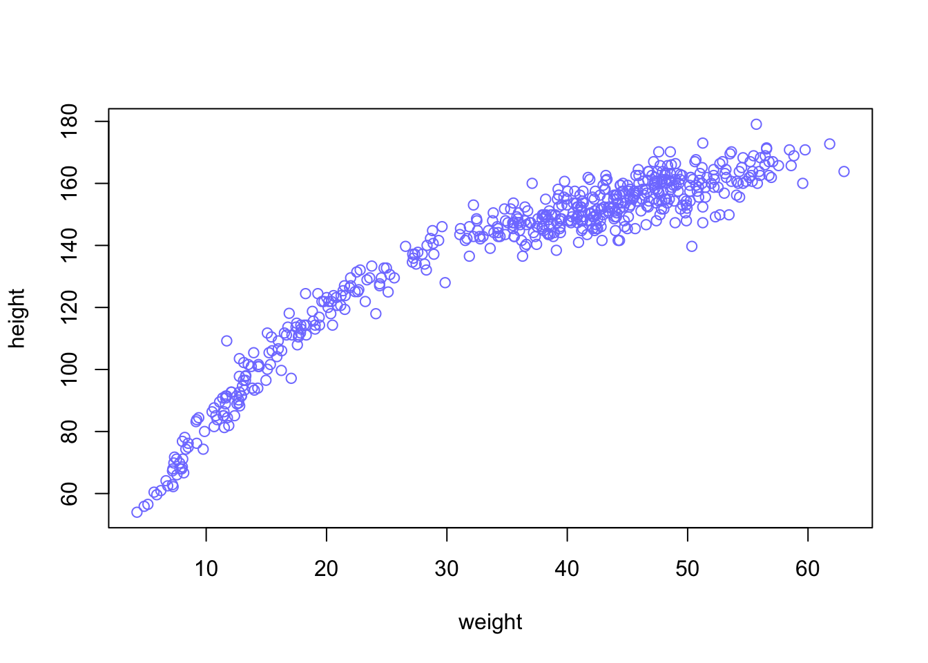 plot(height ~ weight, data = d2_a, col = rethinking::rangi2)