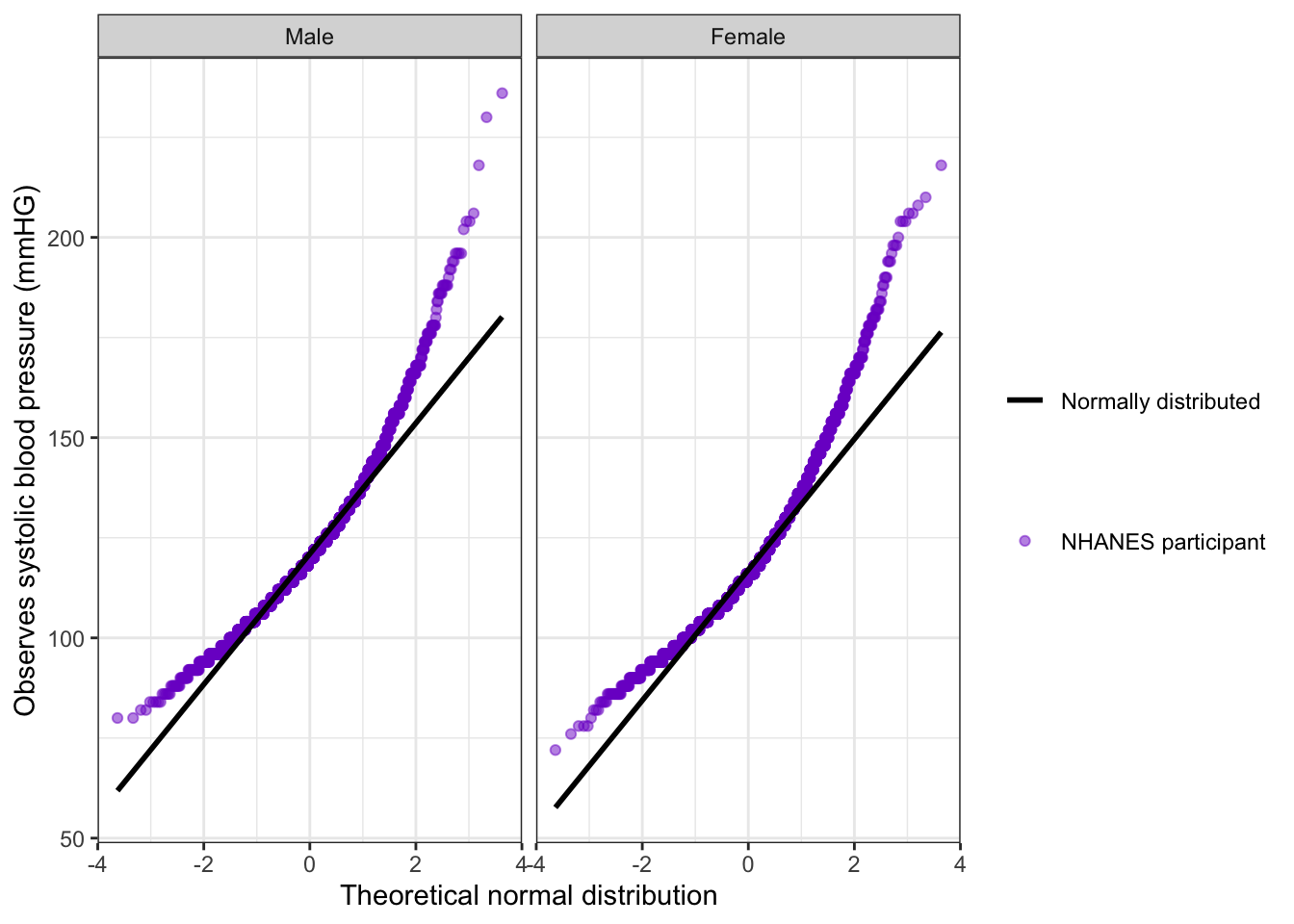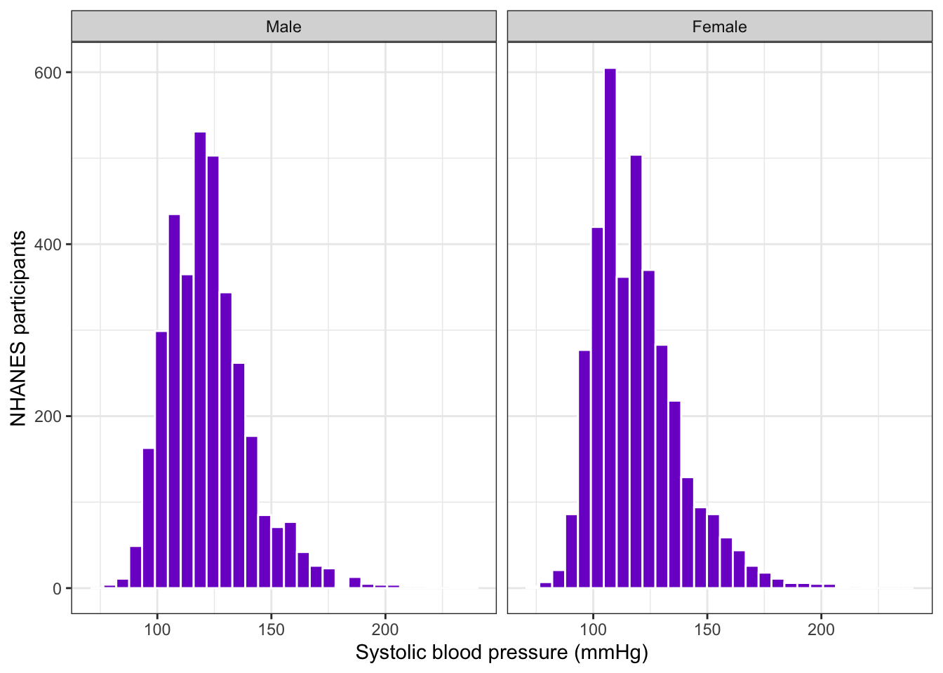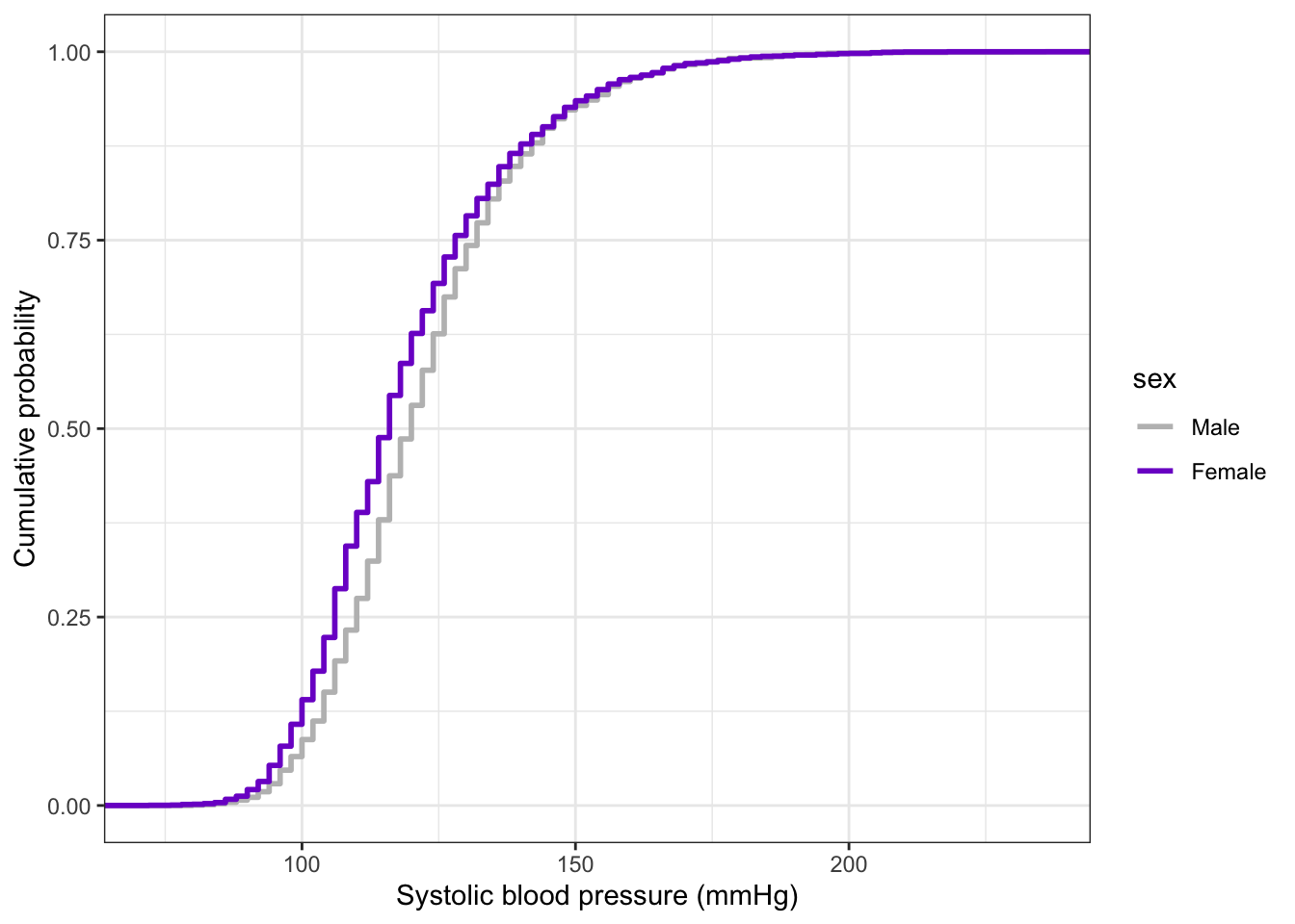 bp_clean|>ggplot2::ggplot(ggplot2::aes( x =systolic, color =sex))+ggplot2::stat_ecdf( geom ="step", linewidth =1, na.rm =TRUE)+ggplot2::labs( x ="Systolic blood pressure (mmHg)", y ="Cumulative probability")+ggplot2::scale_color_manual( values =c("Male"="gray", "Female"="purple3"))