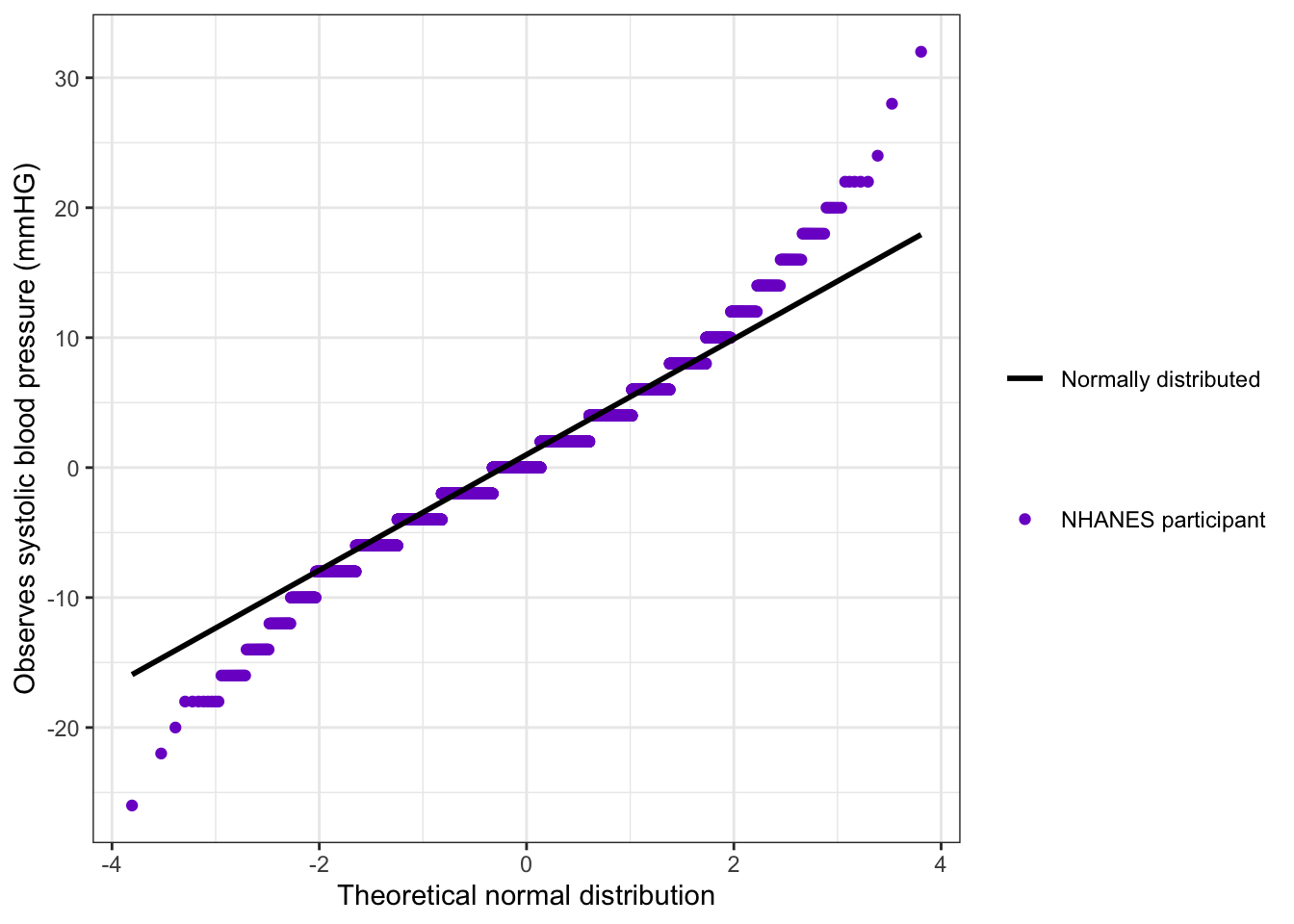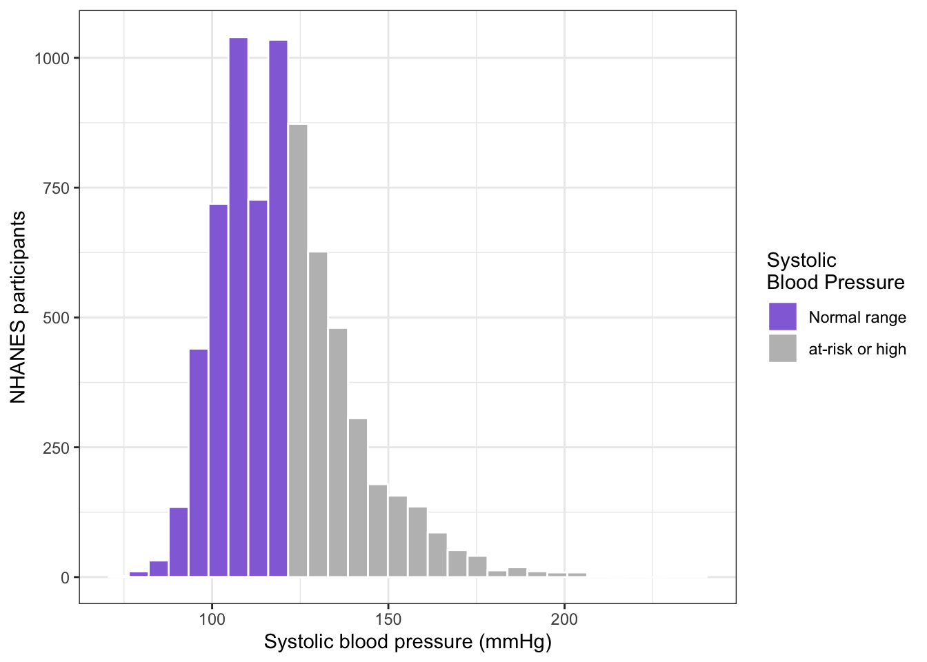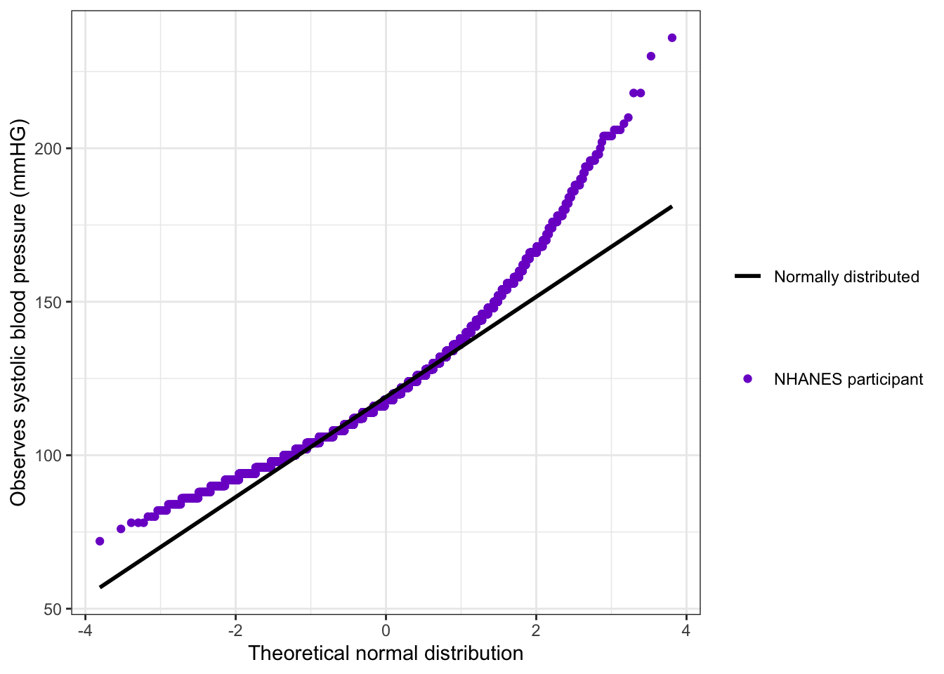 bp_clean|>ggplot2::ggplot(ggplot2::aes( x =systolic, color =sex))+ggplot2::stat_ecdf( geom ="step", linewidth =1, na.rm =TRUE)+ggplot2::labs( x ="Systolic blood pressure (mmHg)", y ="Cumulative probability")+ggplot2::scale_color_manual( values =c("Male"="gray", "Female"="purple3"))