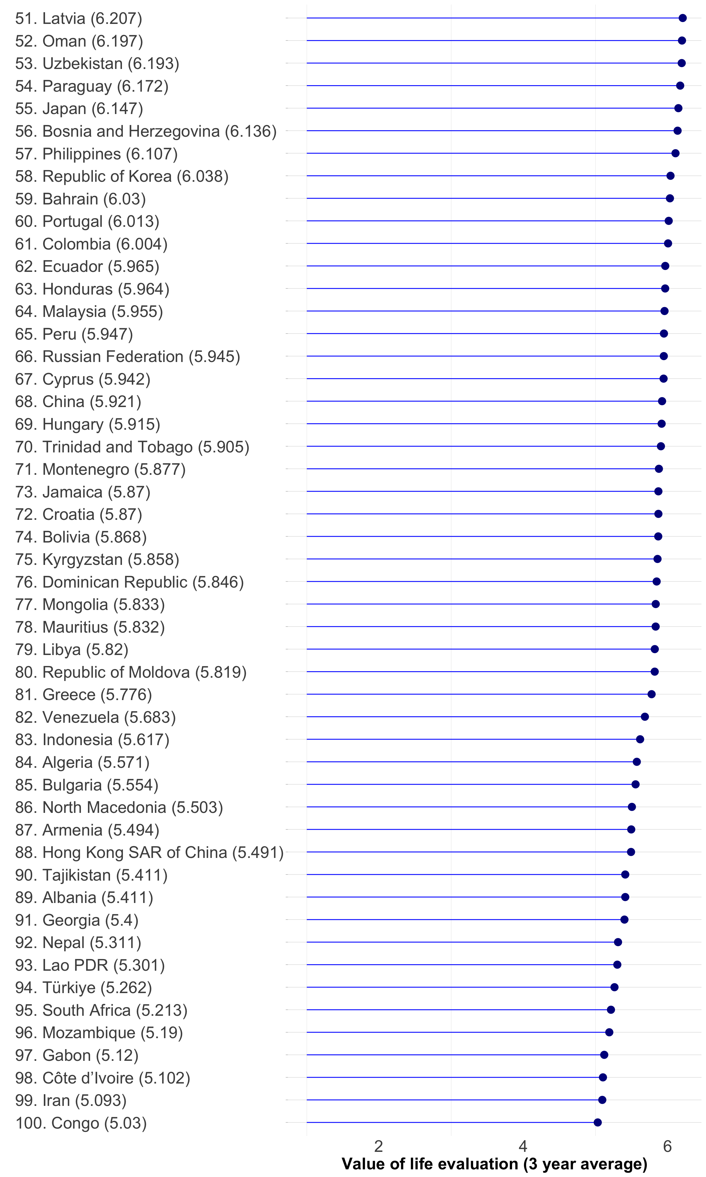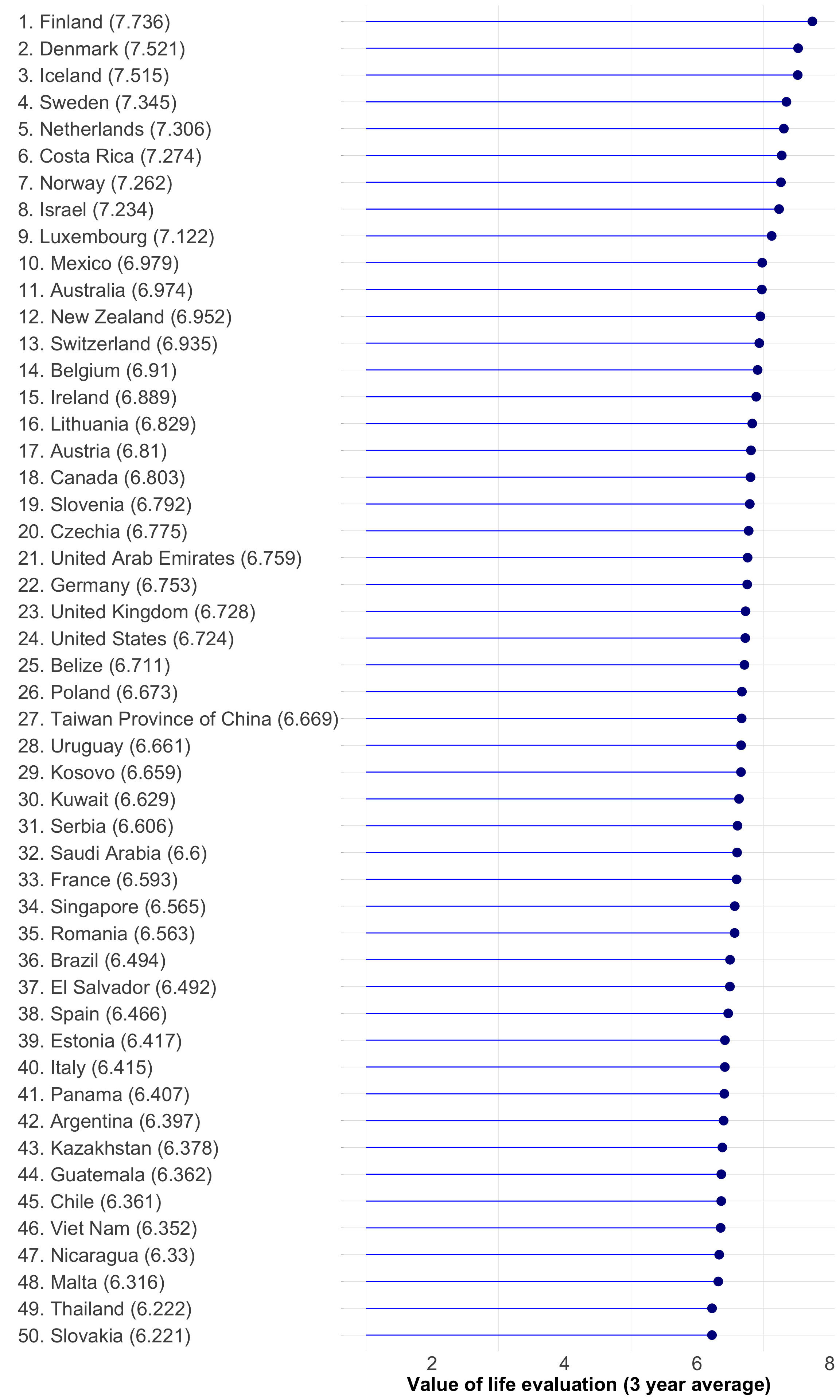 cantril_ranking<-function(df){ggplot2::ggplot(df,ggplot2::aes( x =forcats::fct_reorder(`country`, `ladder_score`) , y =`ladder_score`))+ggplot2::geom_segment(ggplot2::aes( x =`country`, xend =`country`, y =1, yend =`ladder_score`), color ="blue")+ggplot2::geom_point(color ="darkblue", size =4)+ggplot2::theme_light()+ggplot2::theme( panel.grid.major.x =ggplot2::element_blank(), panel.border =ggplot2::element_blank(), axis.ticks.x =ggplot2::element_blank(), axis.text.y =ggplot2::element_text(size =20, hjust =0), axis.text.x =ggplot2::element_text(size =20), axis.title.x =ggplot2::element_text(size =20, face ='bold'))+ggplot2::coord_flip()+ggplot2::xlab("")+ggplot2::ylab("Value of life evaluation (3 year average)")}