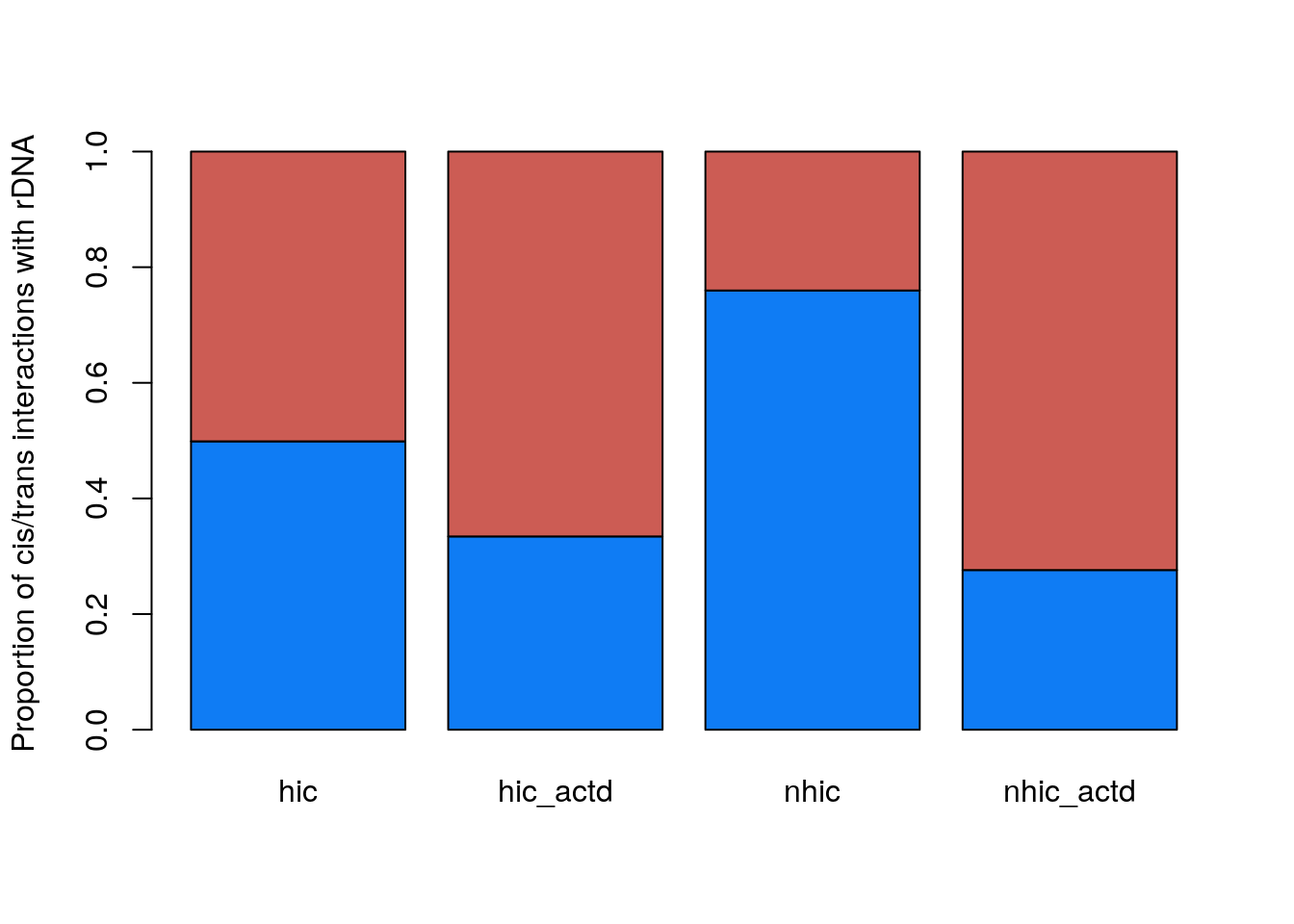 beside=F,ylab = 'Proportion of cis/trans interactions with rDNA')