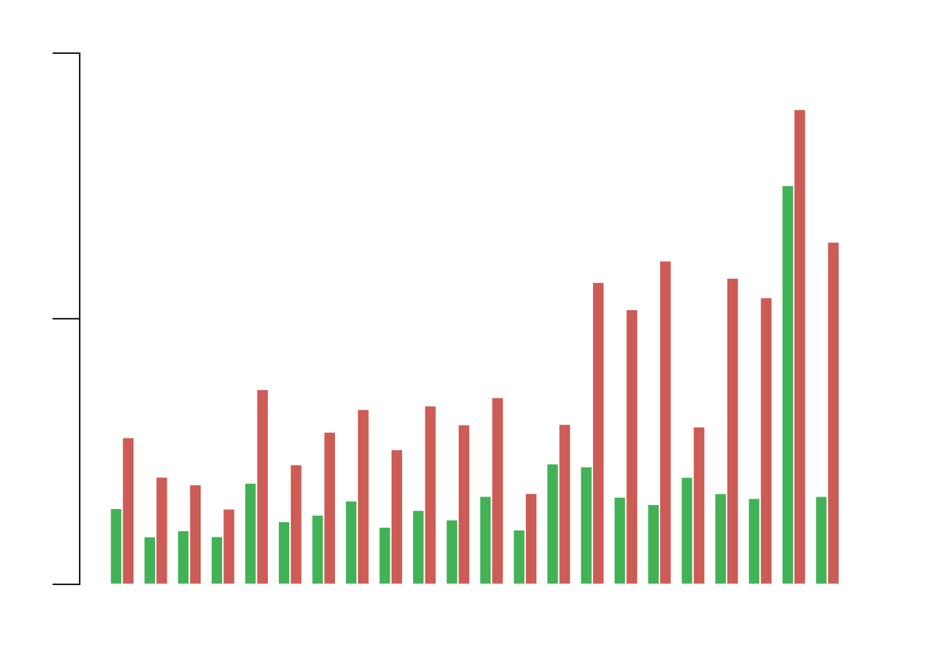 barplot(hotspot.matrix,beside = T,col=c("#42B256","#CC5C55"),border = F,space = c(0,0.8),width = 5,xaxt="n",yaxt="n",ylim=c(0,0.001))