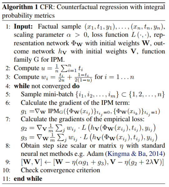 \(\alpha > 0\) then called CFR, \(alpha= 0\) is TARNet (remove the IPM term) Algorithm to learn CFR (remove IPM is TARnet).