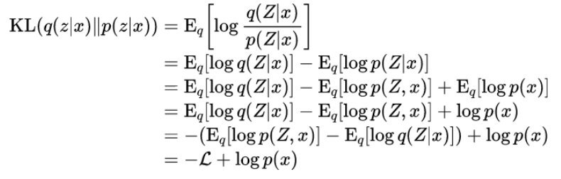 Note: \(log p(x)\) independ to q, so we consider it is a constant. If we see x as the tuple x,y,t then the \(\mathcal{L}\) becomes the lower bound we saw in the paper.
